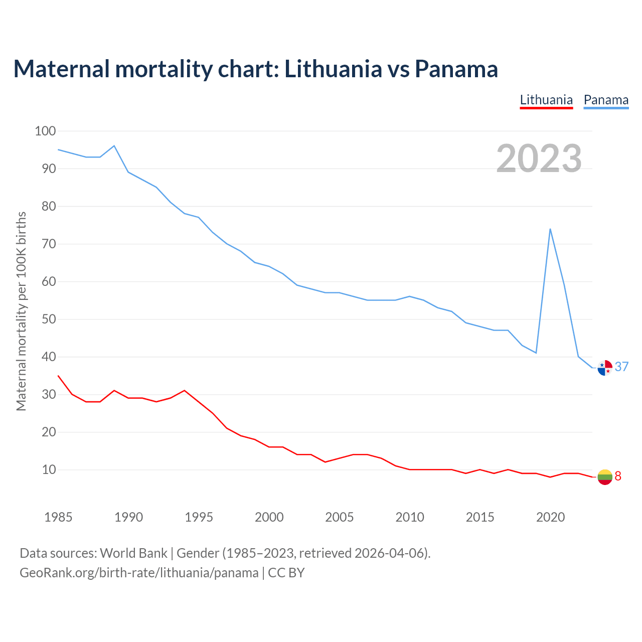 The maternal mortality rate, which is the probability of dying during childbirth or within 42 days of pregnancy termination, is 8 deaths per 100,000 live births in Lithuania, compared to 37 deaths in Panama.