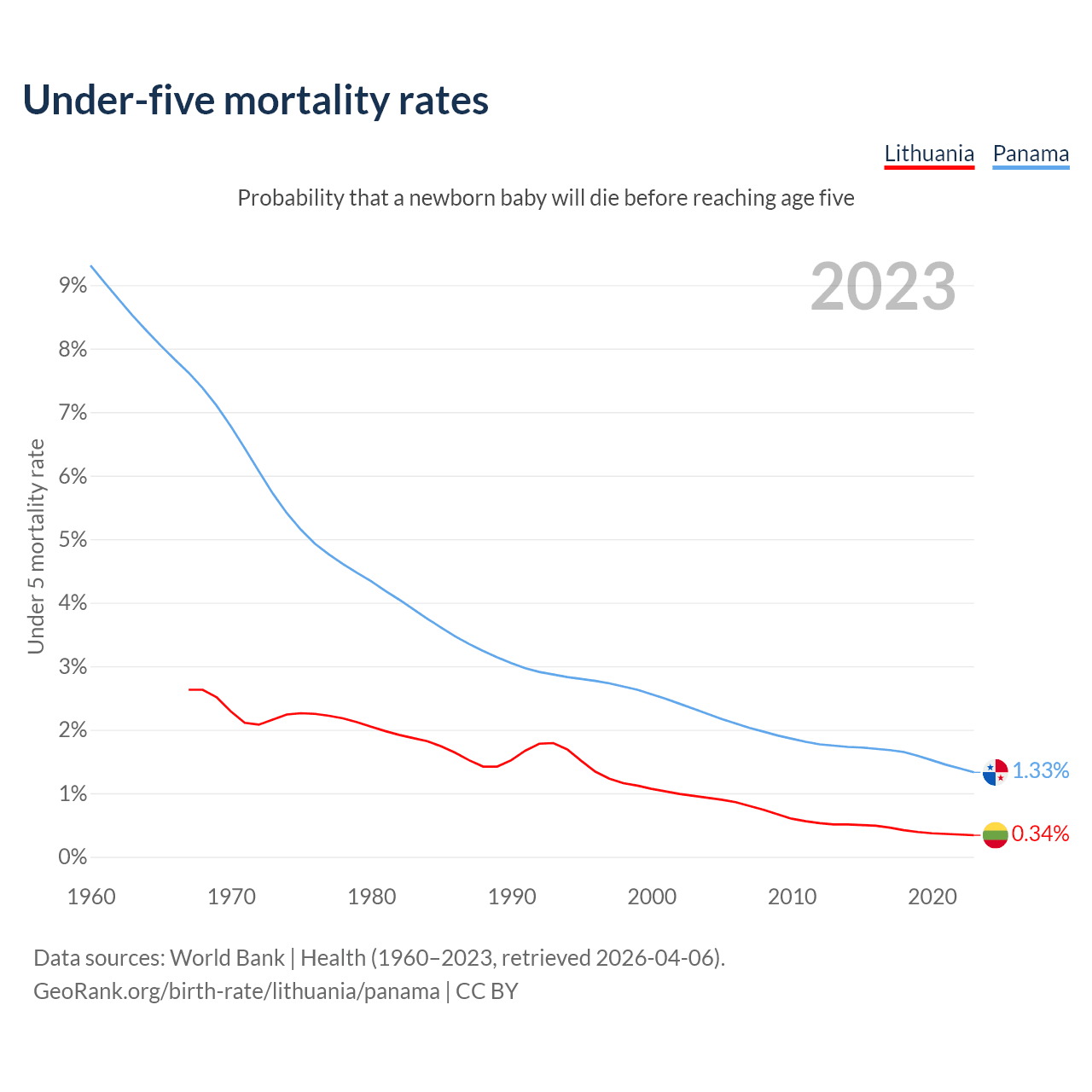 The chance that a newborn baby will die before reaching age five is 0.34% in Lithuania and 1.33% in Panama. Above is a chart with historical data on under-five mortality rates.