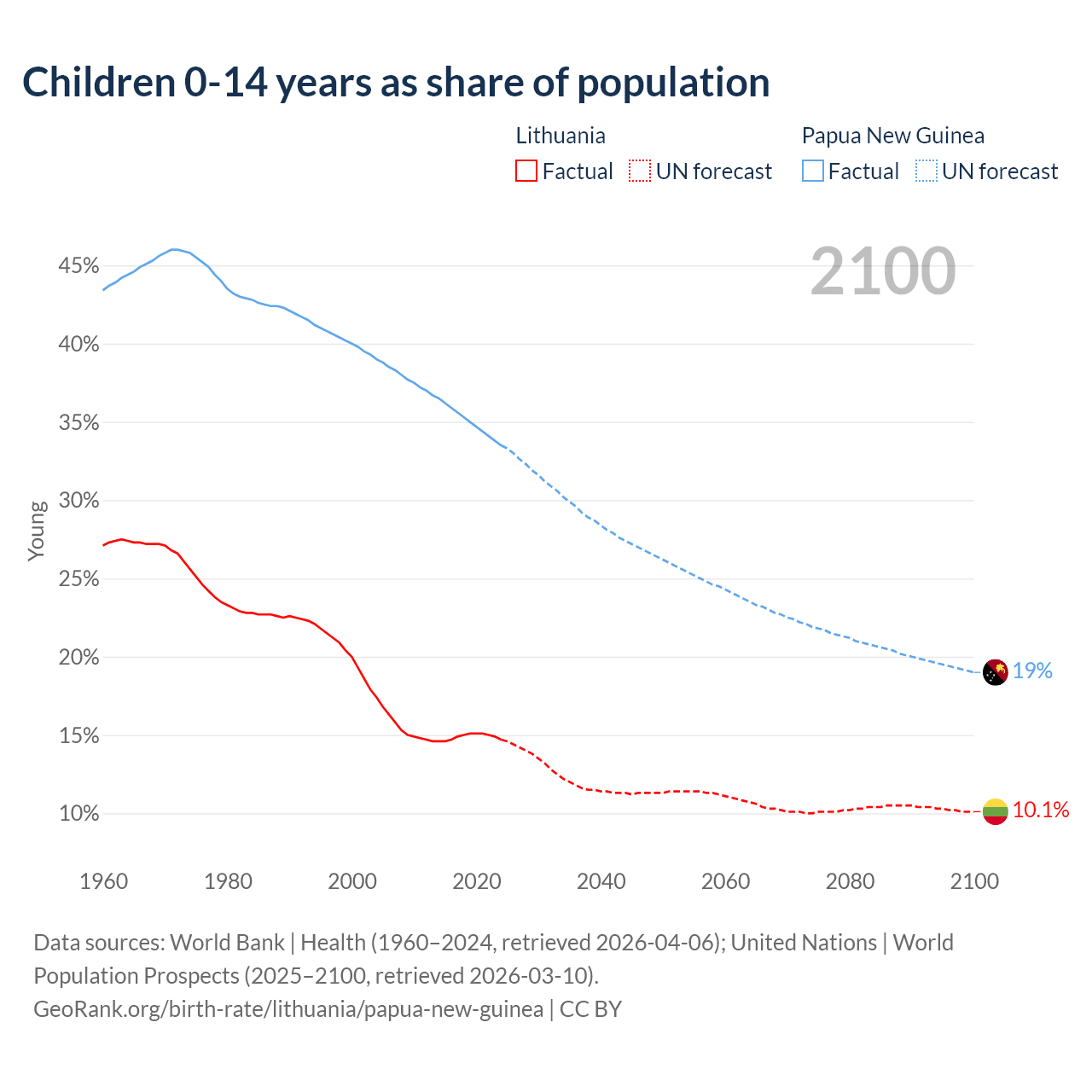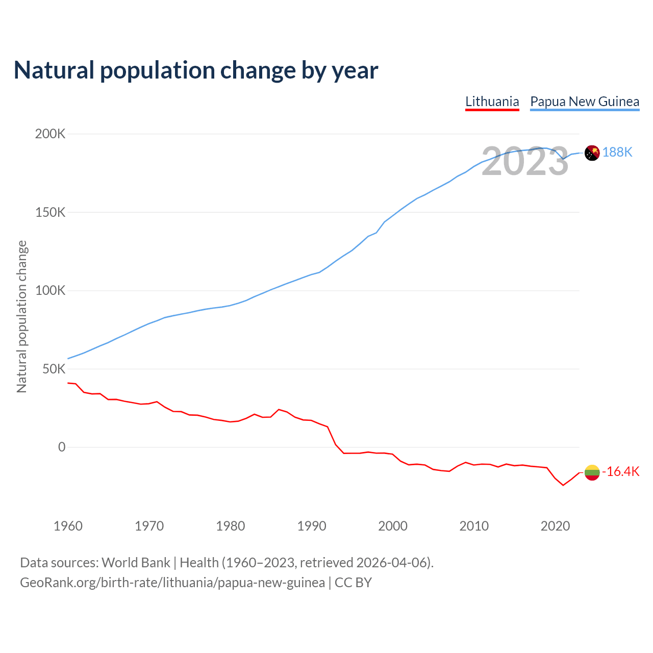 Lithuania has an annual birth rate of 7.2 births per 1,000 people, compared to 24.6 for Papua New Guinea. The average number of children a woman is expected to have during her lifetime — the fertility rate, is 1.18 in Lithuania and 3.1 in Papua New Guinea — 162.6% difference.