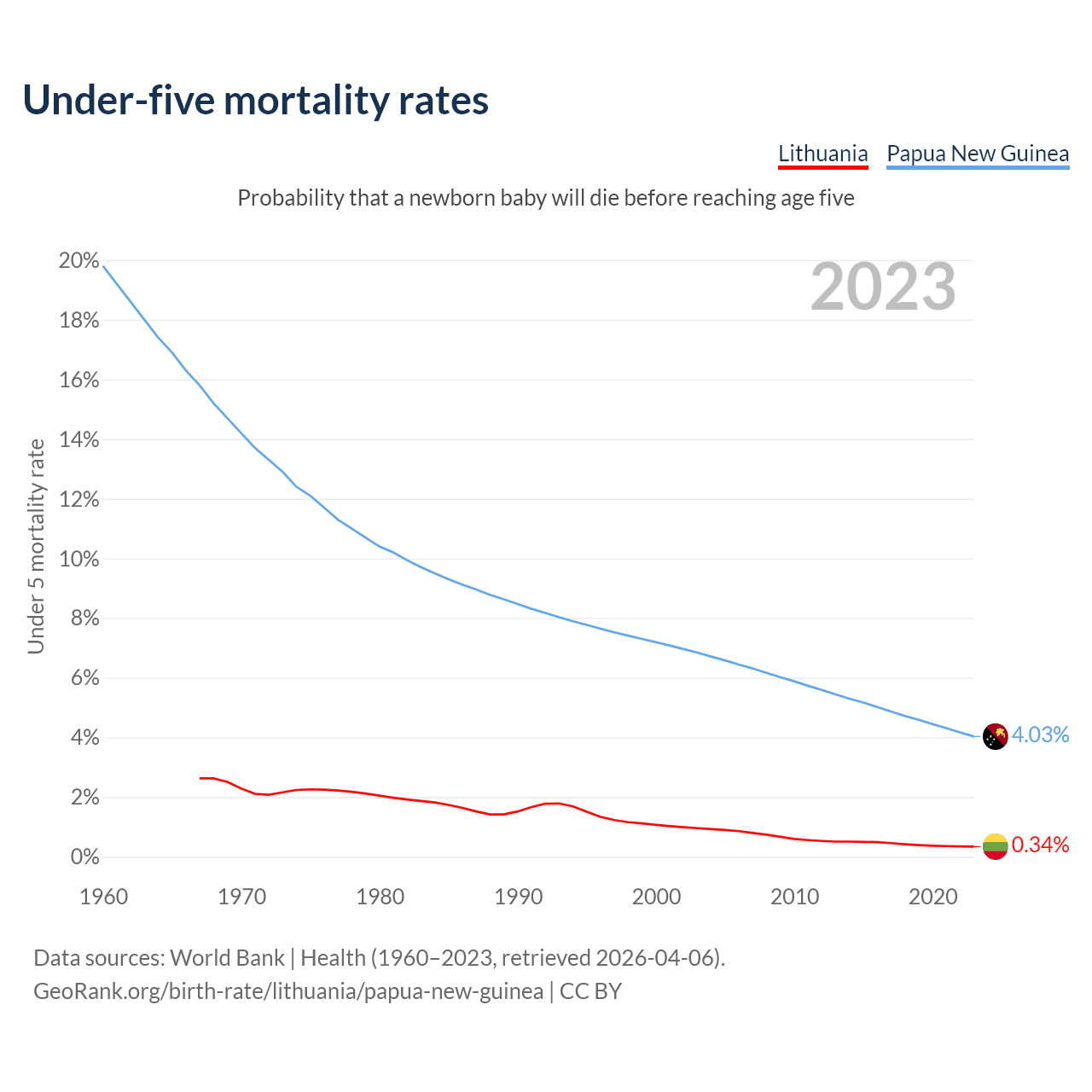 The chance that a newborn baby will die before reaching age five is 0.34% in Lithuania and 4.03% in Papua New Guinea. Above is a chart with historical data on under-five mortality rates.