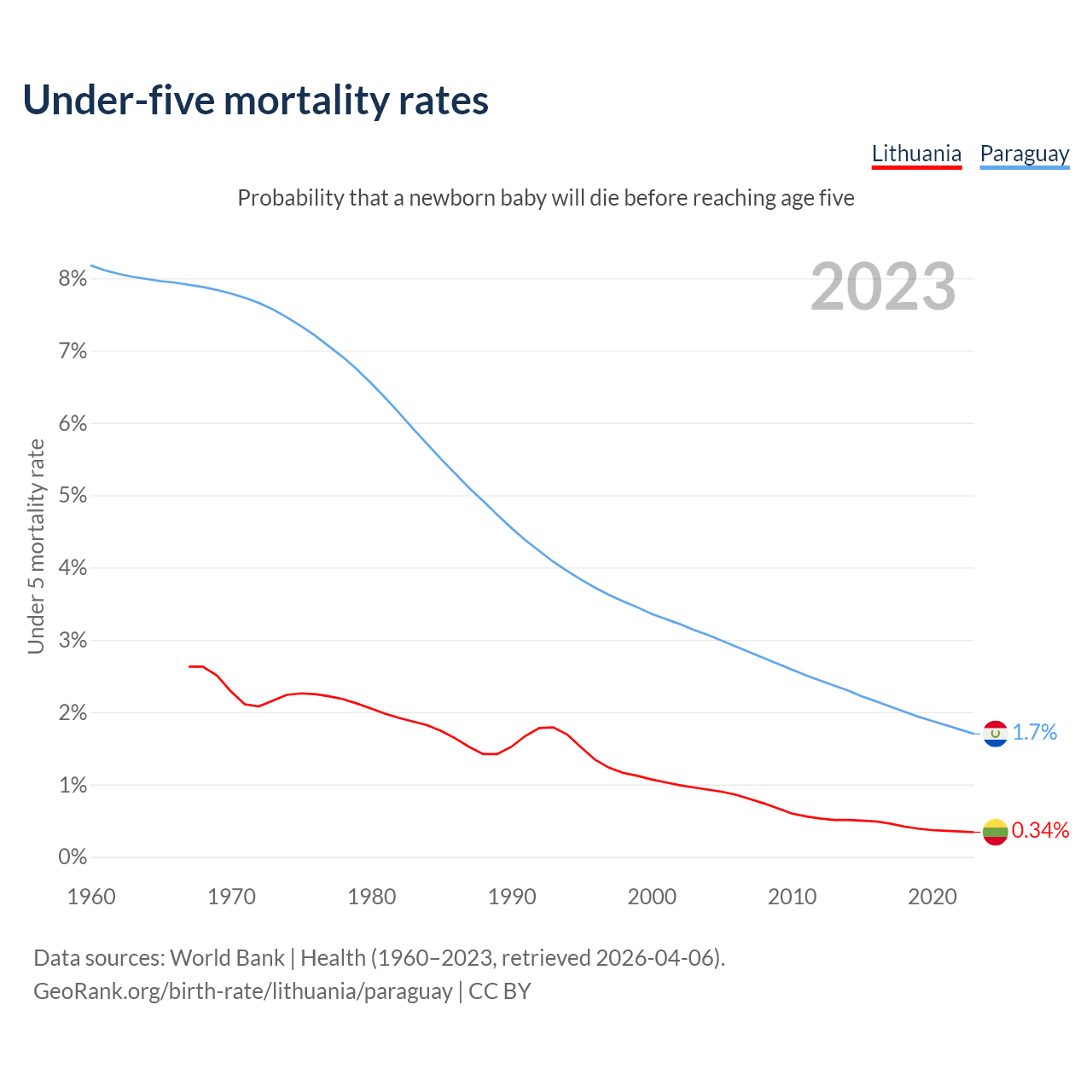 The chance that a newborn baby will die before reaching age five is 0.34% in Lithuania and 1.7% in Paraguay. Above is a chart with historical data on under-five mortality rates.
