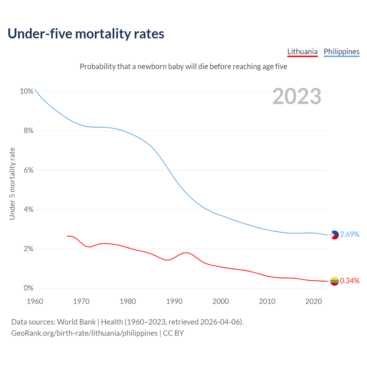 The chance that a newborn baby will die before reaching age five is 0.34% in Lithuania and 2.69% in the Philippines. Above is a chart with historical data on under-five mortality rates.