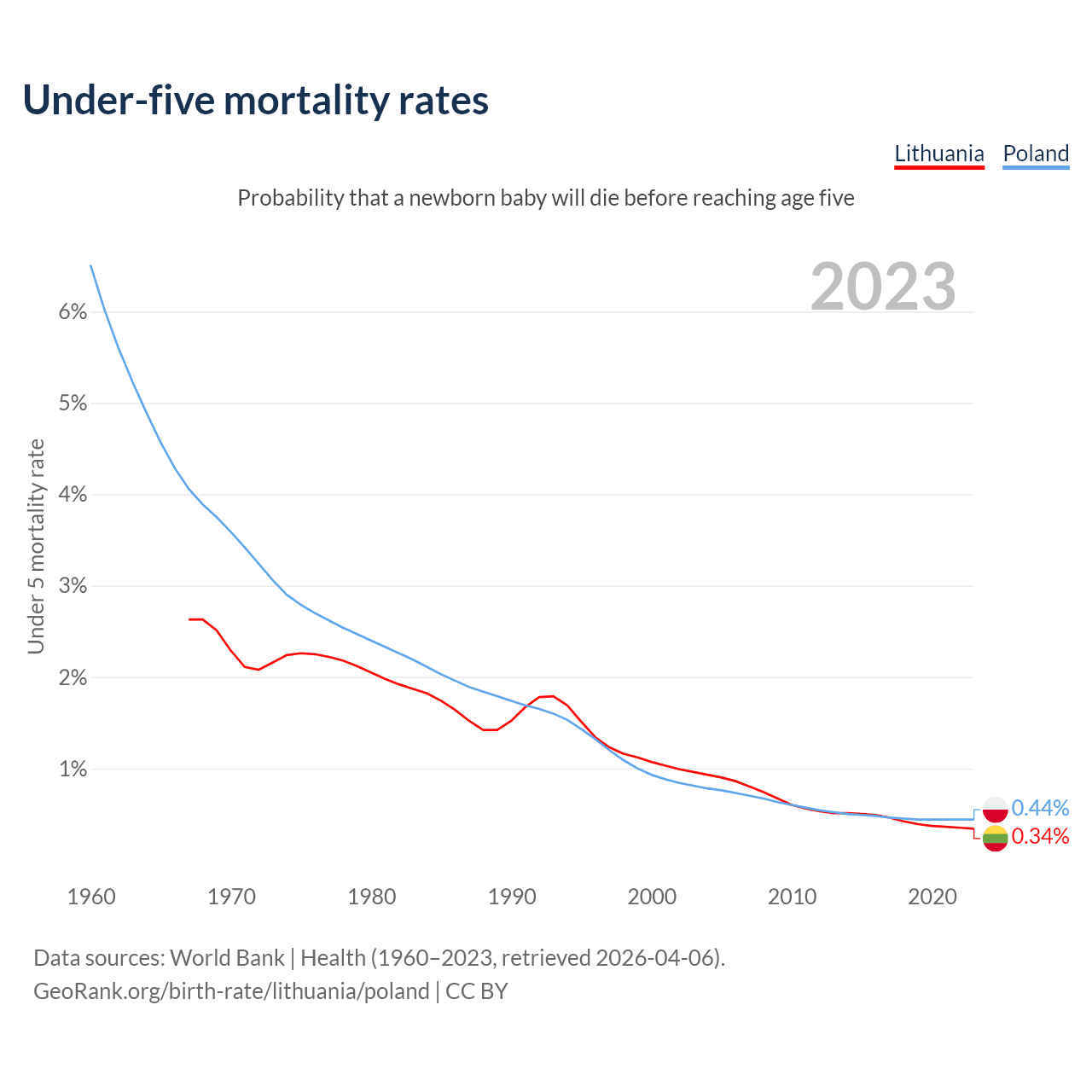 The chance that a newborn baby will die before reaching age five is 0.34% in Lithuania and 0.44% in Poland. Above is a chart with historical data on under-five mortality rates.