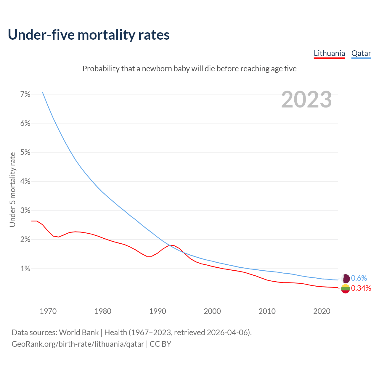 The chance that a newborn baby will die before reaching age five is 0.34% in Lithuania and 0.6% in Qatar. Above is a chart with historical data on under-five mortality rates.