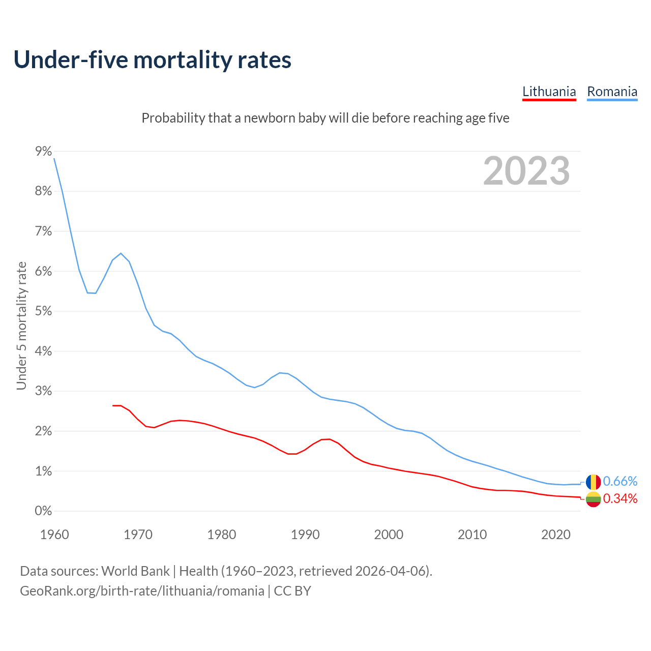 The chance that a newborn baby will die before reaching age five is 0.34% in Lithuania and 0.66% in Romania. Above is a chart with historical data on under-five mortality rates.