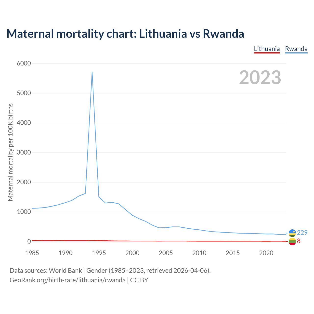 The maternal mortality rate, which is the probability of dying during childbirth or within 42 days of pregnancy termination, is 8 deaths per 100,000 live births in Lithuania, compared to 229 deaths in Rwanda.