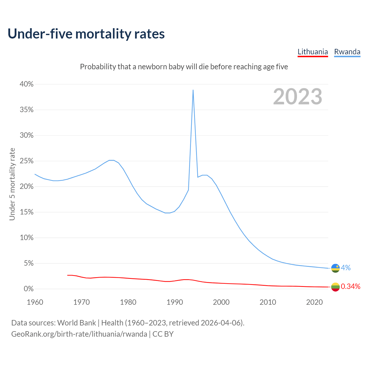 The chance that a newborn baby will die before reaching age five is 0.34% in Lithuania and 4% in Rwanda. Above is a chart with historical data on under-five mortality rates.