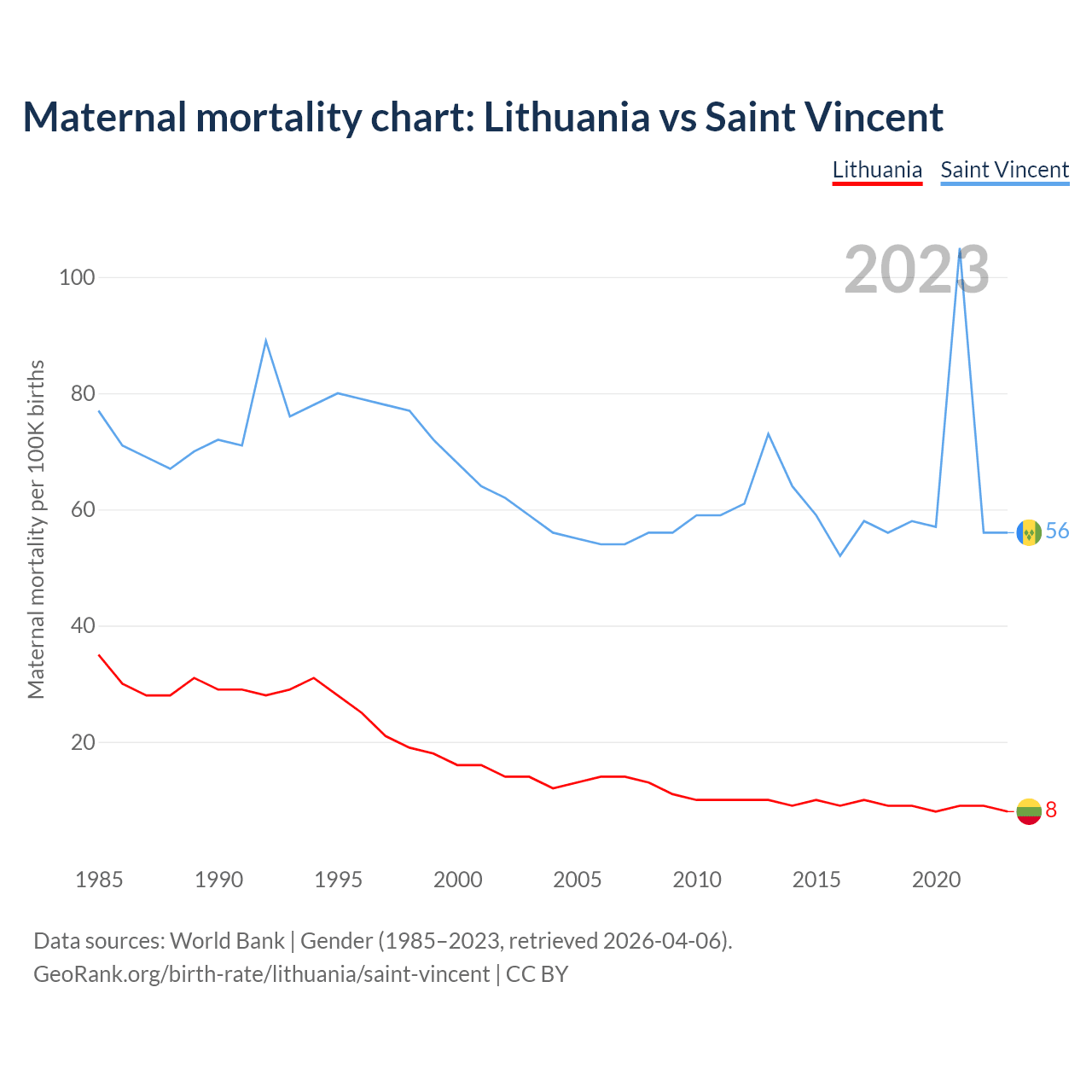 The maternal mortality rate, which is the probability of dying during childbirth or within 42 days of pregnancy termination, is 8 deaths per 100,000 live births in Lithuania, compared to 56 deaths in Saint Vincent.