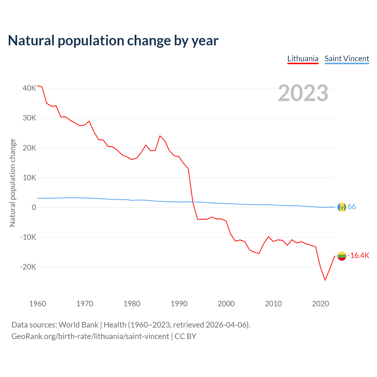 - Lithuania is ranked 185/196 by birth rate compared to 116/196 for Saint Vincent.
