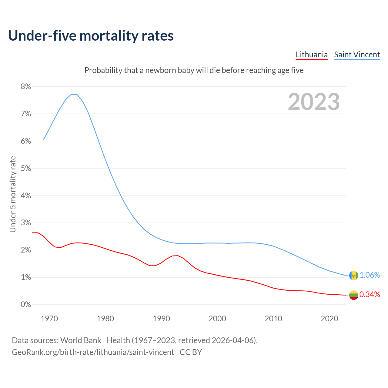 The chance that a newborn baby will die before reaching age five is 0.34% in Lithuania and 1.06% in Saint Vincent. Above is a chart with historical data on under-five mortality rates.
