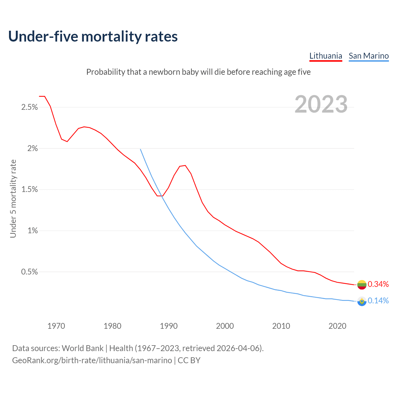 The chance that a newborn baby will die before reaching age five is 0.34% in Lithuania and 0.14% in San Marino. Above is a chart with historical data on under-five mortality rates.