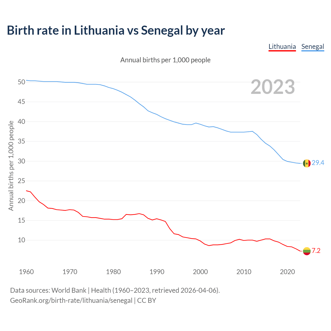 Lithuania has an annual birth rate of 7.2 births per 1,000 people, compared to 29.4 for Senegal. The average number of children a woman is expected to have during her lifetime — the fertility rate, is 1.18 in Lithuania and 3.82 in Senegal — 223.6% difference.
