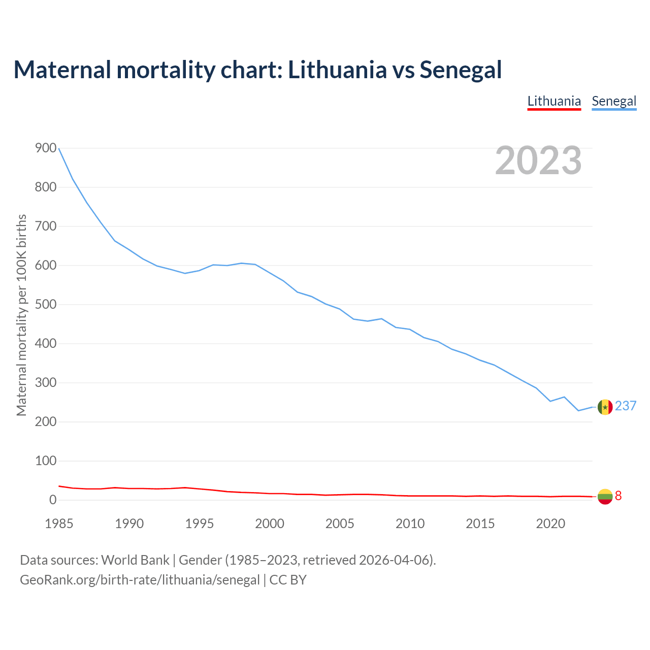 The maternal mortality rate, which is the probability of dying during childbirth or within 42 days of pregnancy termination, is 8 deaths per 100,000 live births in Lithuania, compared to 237 deaths in Senegal.