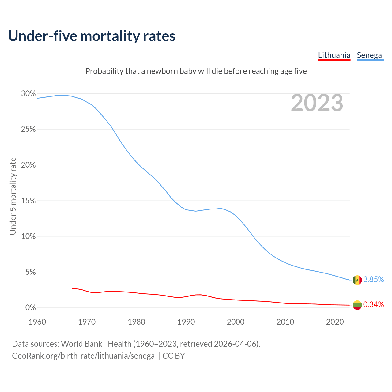 The chance that a newborn baby will die before reaching age five is 0.34% in Lithuania and 3.85% in Senegal. Above is a chart with historical data on under-five mortality rates.