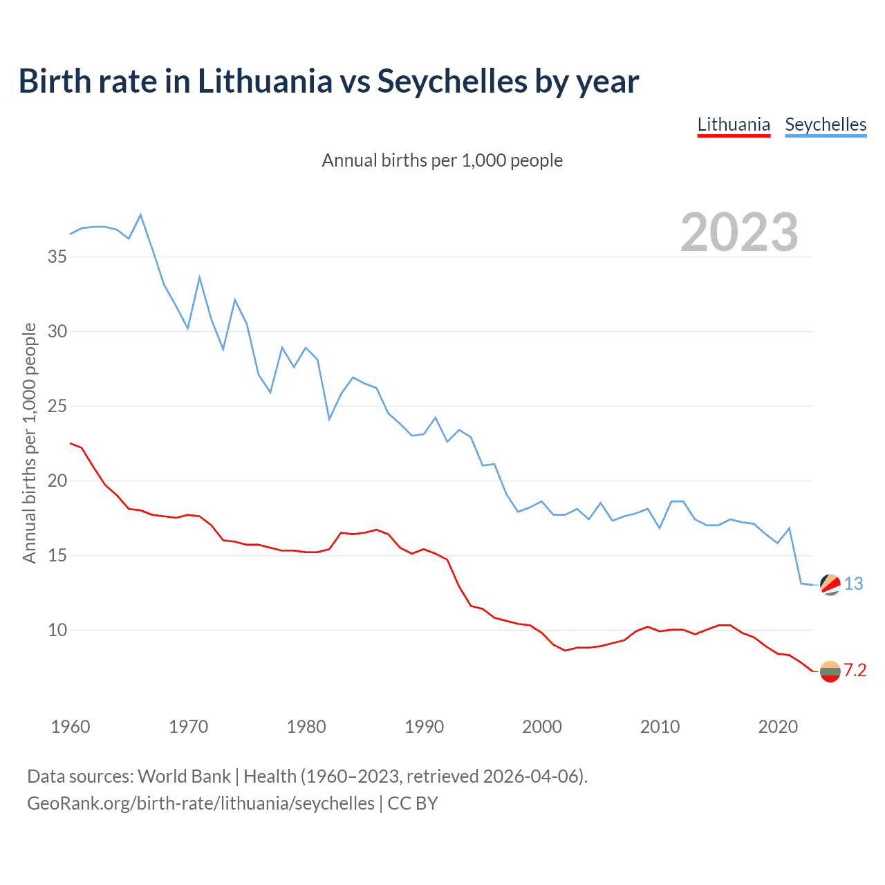 Lithuania has an annual birth rate of 7.2 births per 1,000 people, compared to 13 for the Seychelles. The average number of children a woman is expected to have during her lifetime — the fertility rate, is 1.18 in Lithuania and 2.02 in the Seychelles — 71.2% difference.