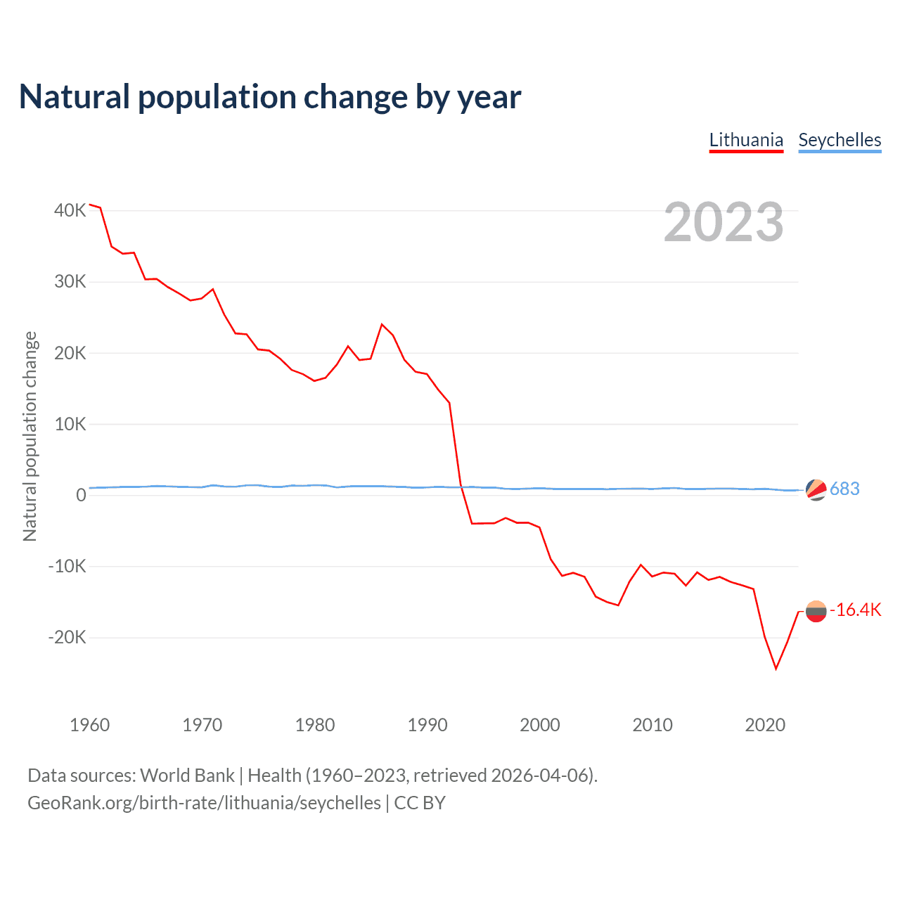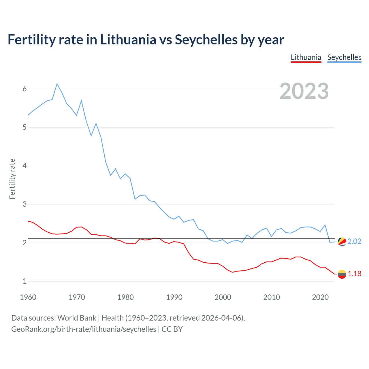 According to the latest available data on birth rates, the fertility rate in Lithuania was 1.18 children per woman in 2023, compared to 2.02 in the Seychelles in 2023. The replacement level is considered to be 2.1 children per woman.