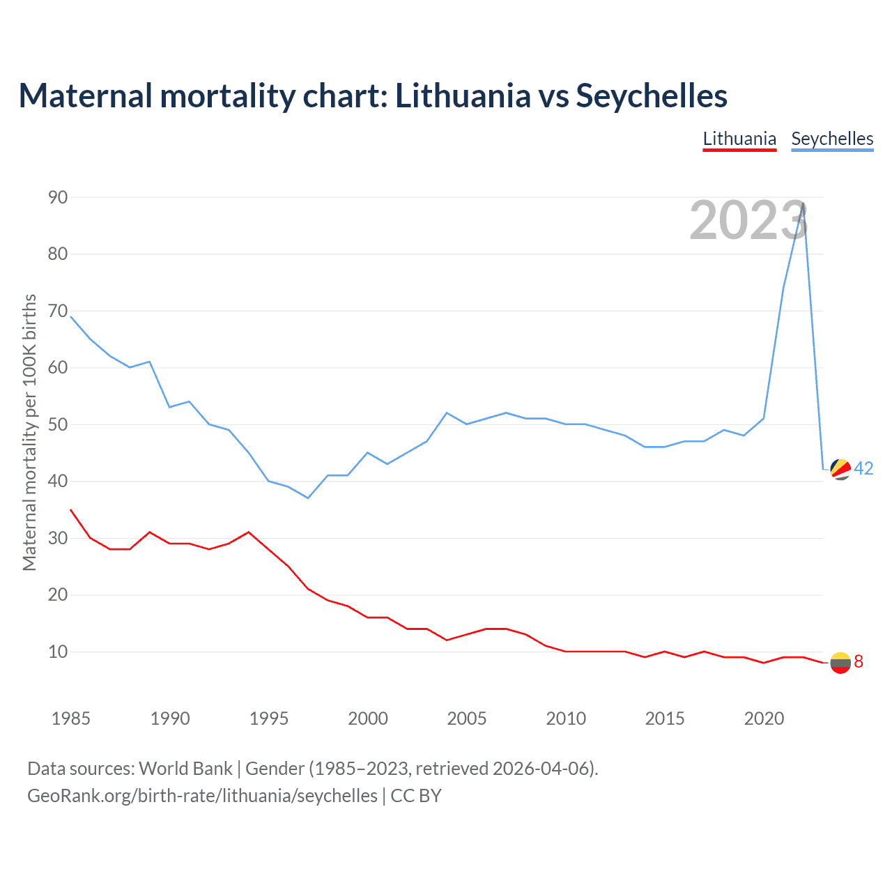 The maternal mortality rate, which is the probability of dying during childbirth or within 42 days of pregnancy termination, is 8 deaths per 100,000 live births in Lithuania, compared to 42 deaths in the Seychelles.