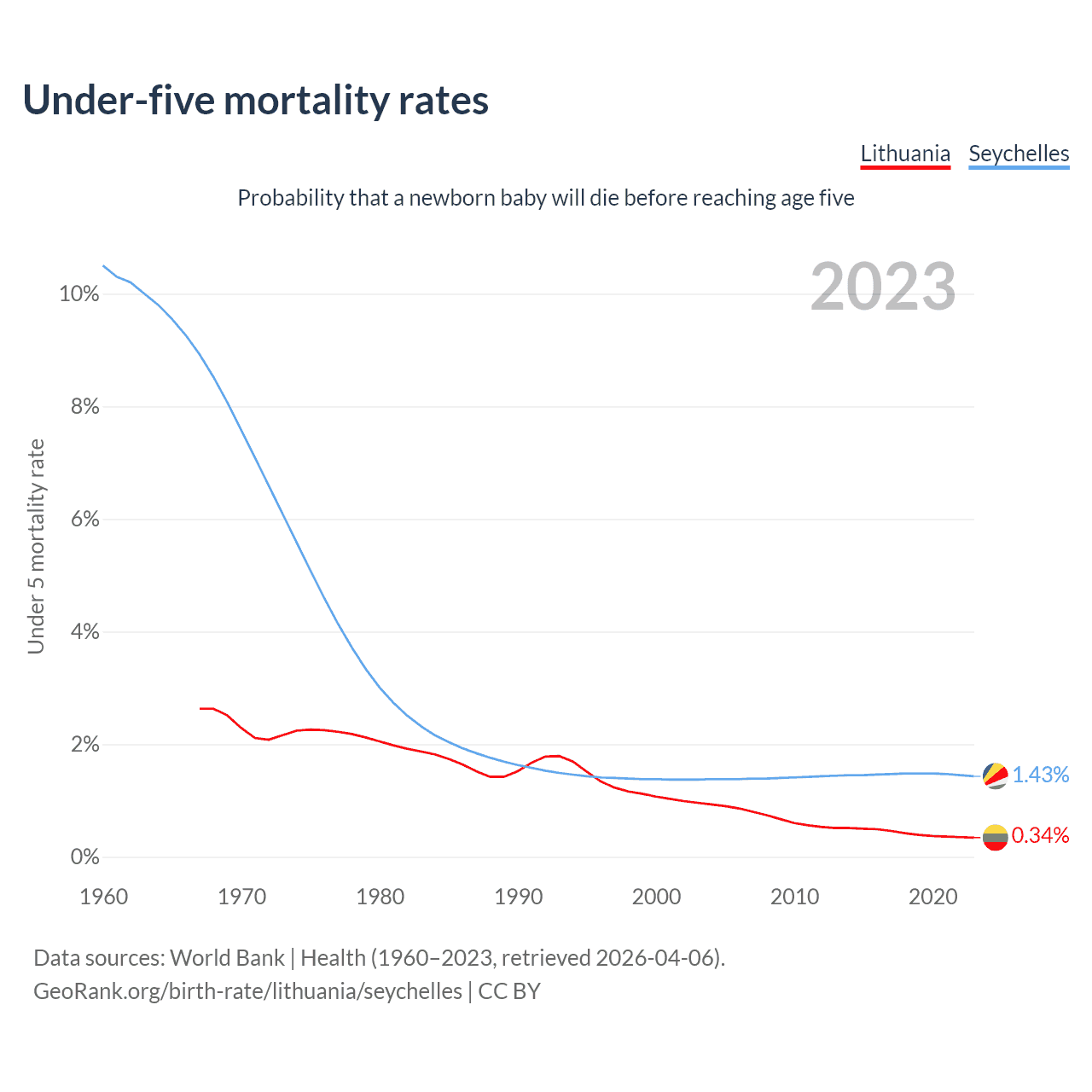 The chance that a newborn baby will die before reaching age five is 0.34% in Lithuania and 1.43% in the Seychelles. Above is a chart with historical data on under-five mortality rates.
