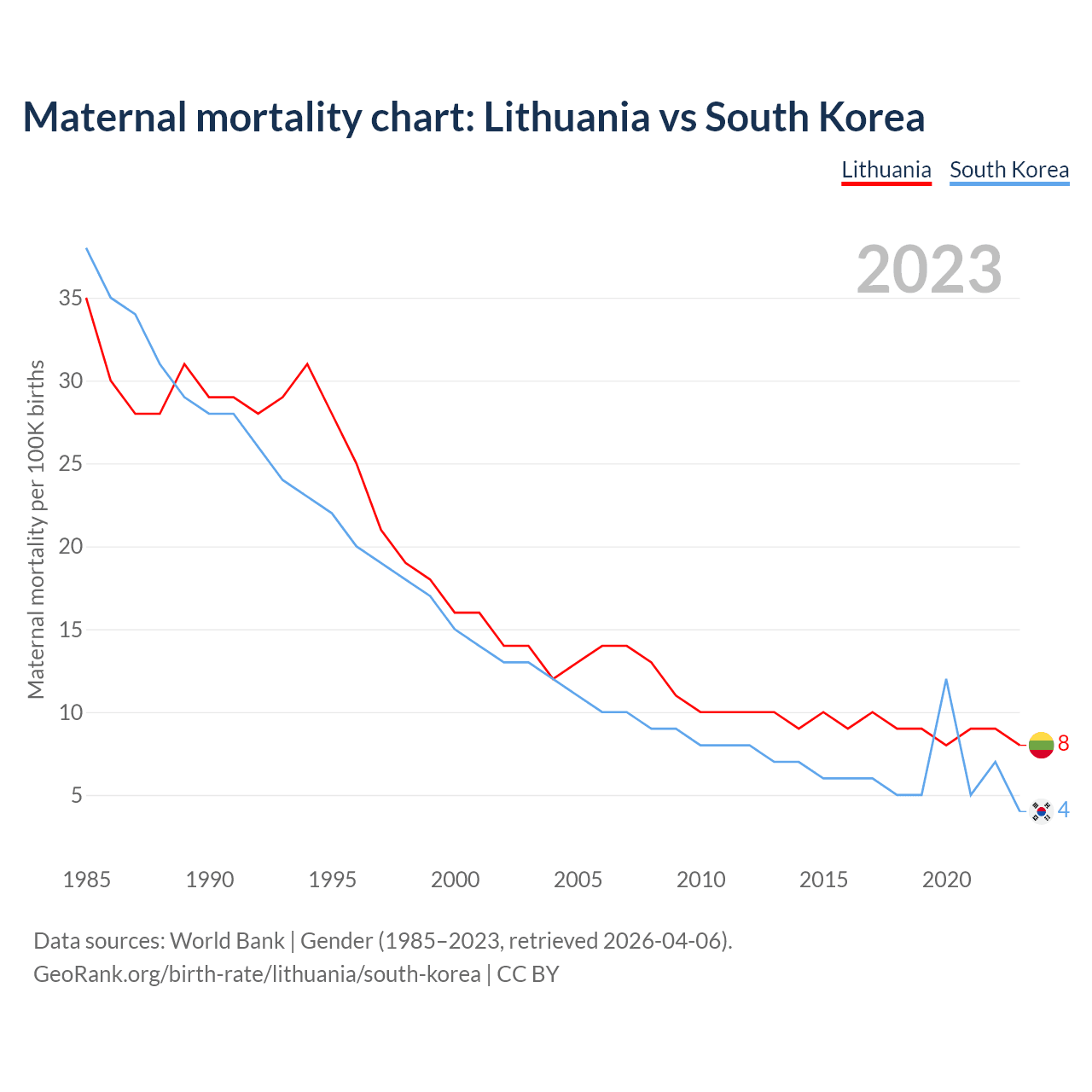 The maternal mortality rate, which is the probability of dying during childbirth or within 42 days of pregnancy termination, is 8 deaths per 100,000 live births in Lithuania, compared to 4 deaths in South Korea.