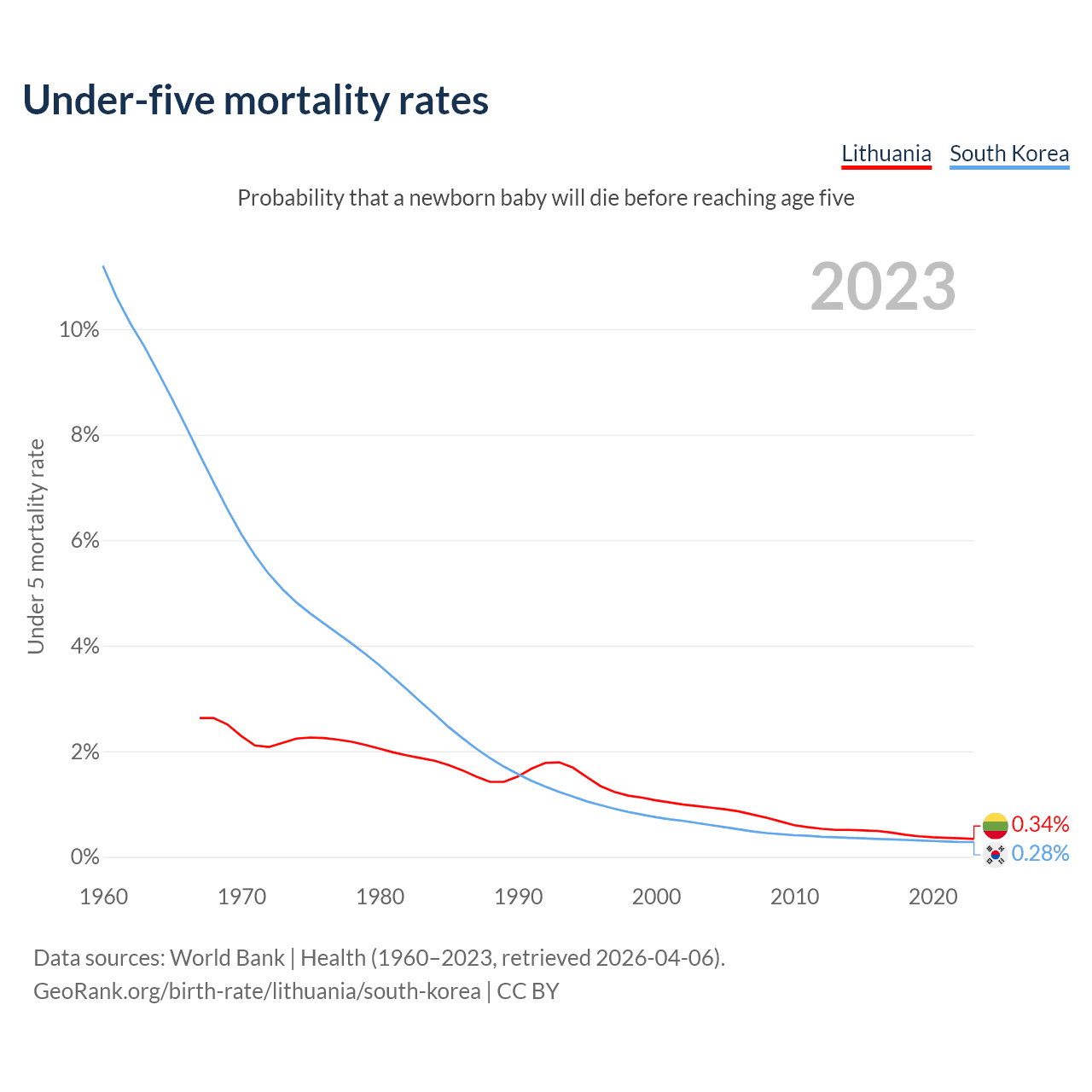 The chance that a newborn baby will die before reaching age five is 0.34% in Lithuania and 0.28% in South Korea. Above is a chart with historical data on under-five mortality rates.