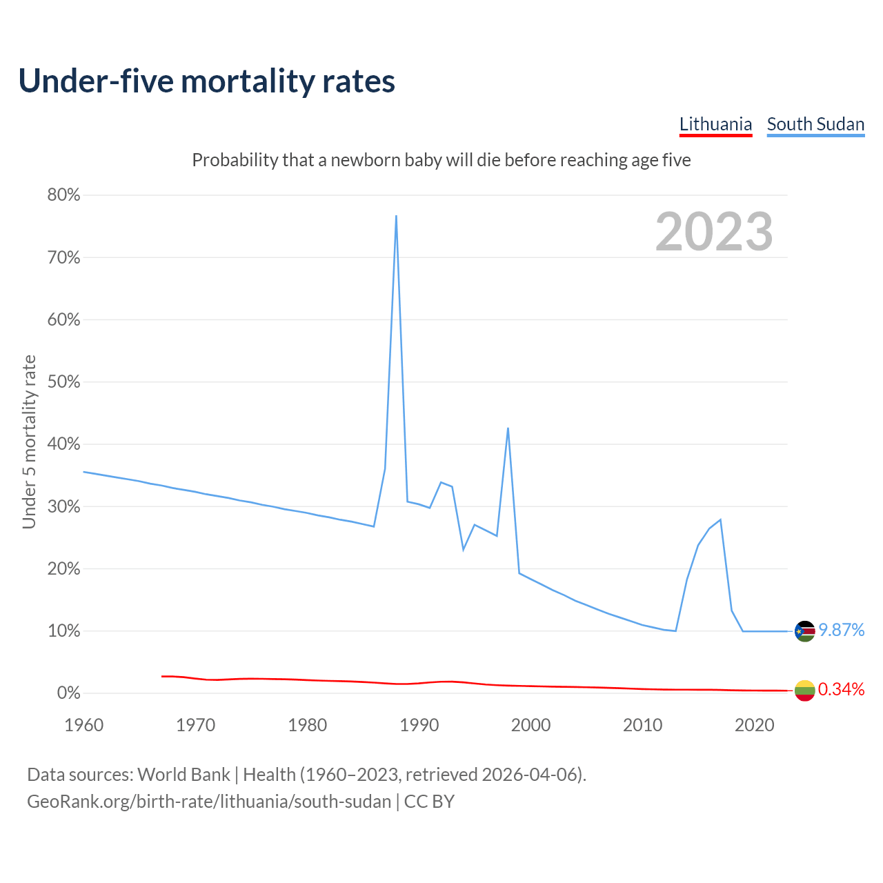 The chance that a newborn baby will die before reaching age five is 0.34% in Lithuania and 9.87% in South Sudan. Above is a chart with historical data on under-five mortality rates.