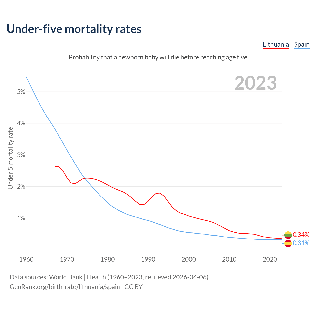 The chance that a newborn baby will die before reaching age five is 0.34% in Lithuania and 0.31% in Spain. Above is a chart with historical data on under-five mortality rates.