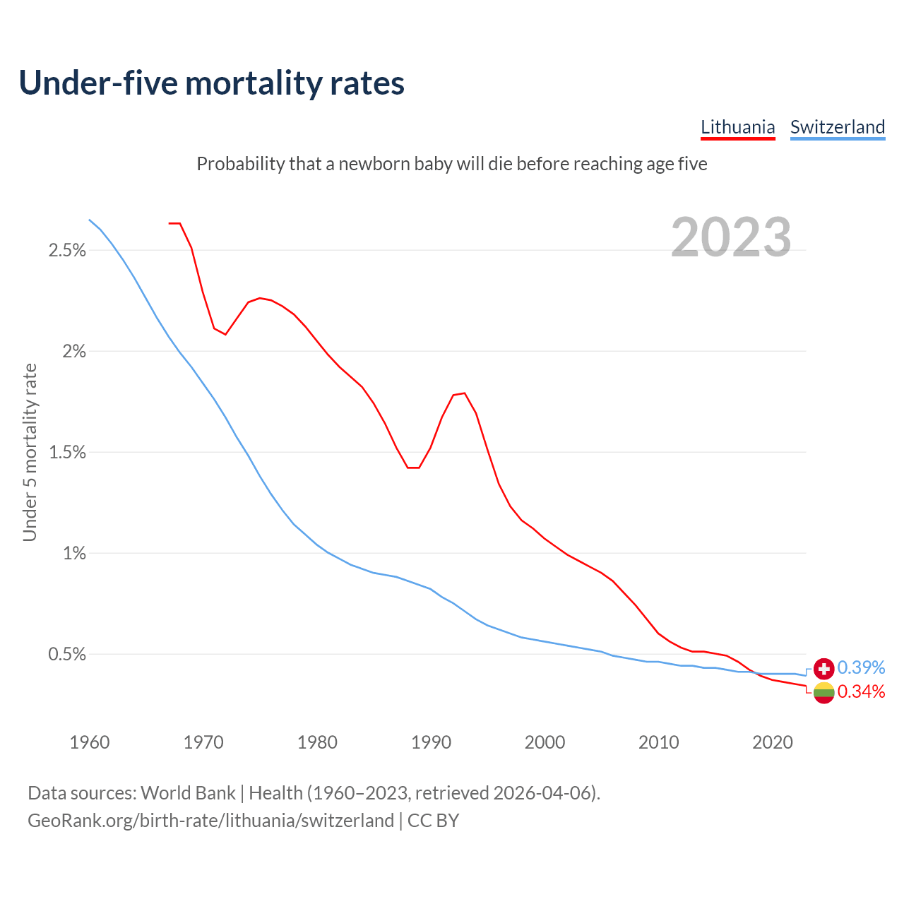 The chance that a newborn baby will die before reaching age five is 0.34% in Lithuania and 0.39% in Switzerland. Above is a chart with historical data on under-five mortality rates.