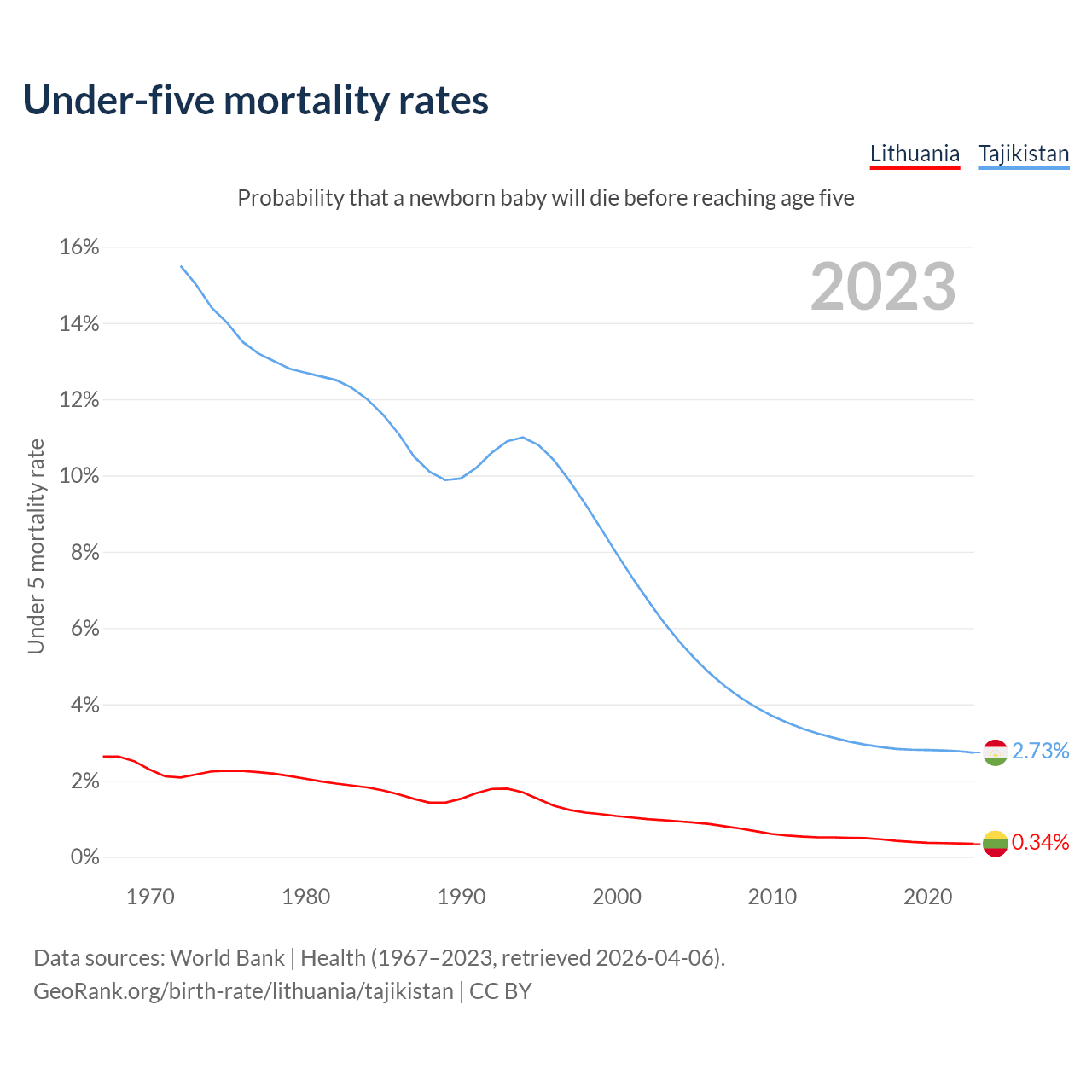 The chance that a newborn baby will die before reaching age five is 0.34% in Lithuania and 2.73% in Tajikistan. Above is a chart with historical data on under-five mortality rates.