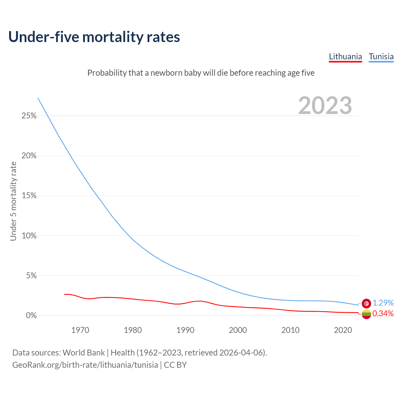The chance that a newborn baby will die before reaching age five is 0.34% in Lithuania and 1.29% in Tunisia. Above is a chart with historical data on under-five mortality rates.