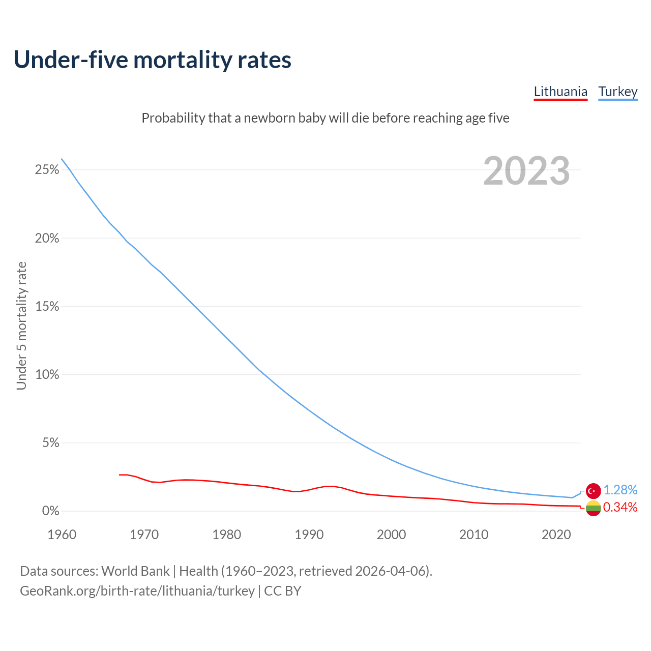 The chance that a newborn baby will die before reaching age five is 0.34% in Lithuania and 1.28% in Turkey. Above is a chart with historical data on under-five mortality rates.