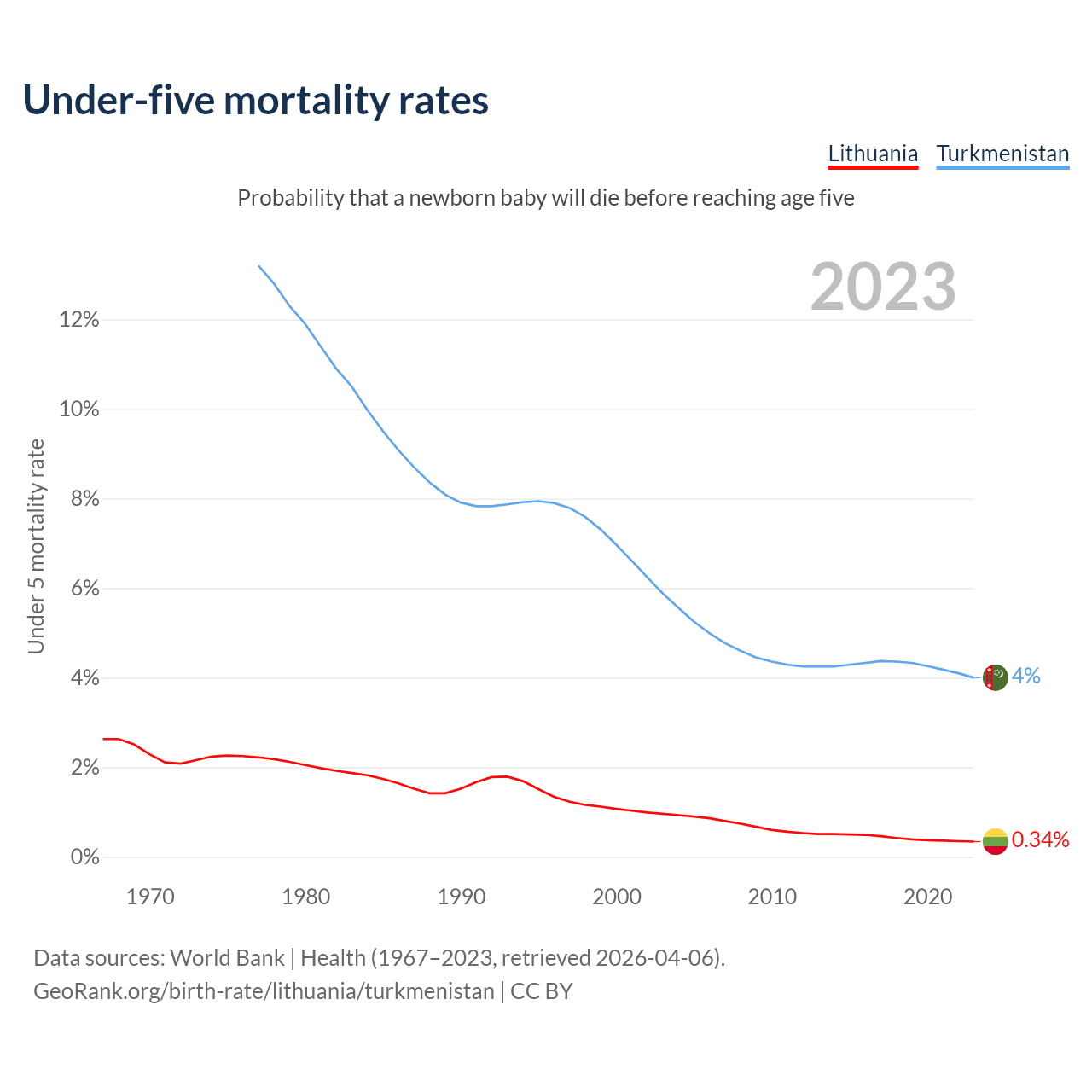 The chance that a newborn baby will die before reaching age five is 0.34% in Lithuania and 4% in Turkmenistan. Above is a chart with historical data on under-five mortality rates.