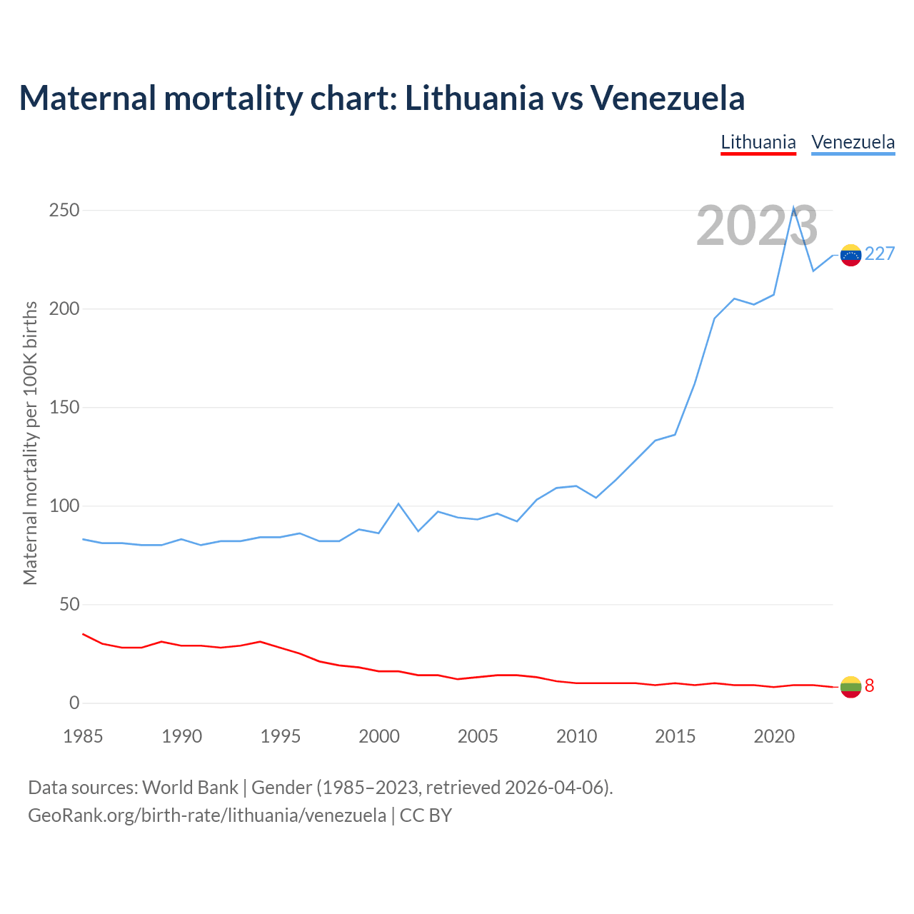 The maternal mortality rate, which is the probability of dying during childbirth or within 42 days of pregnancy termination, is 8 deaths per 100,000 live births in Lithuania, compared to 227 deaths in Venezuela.