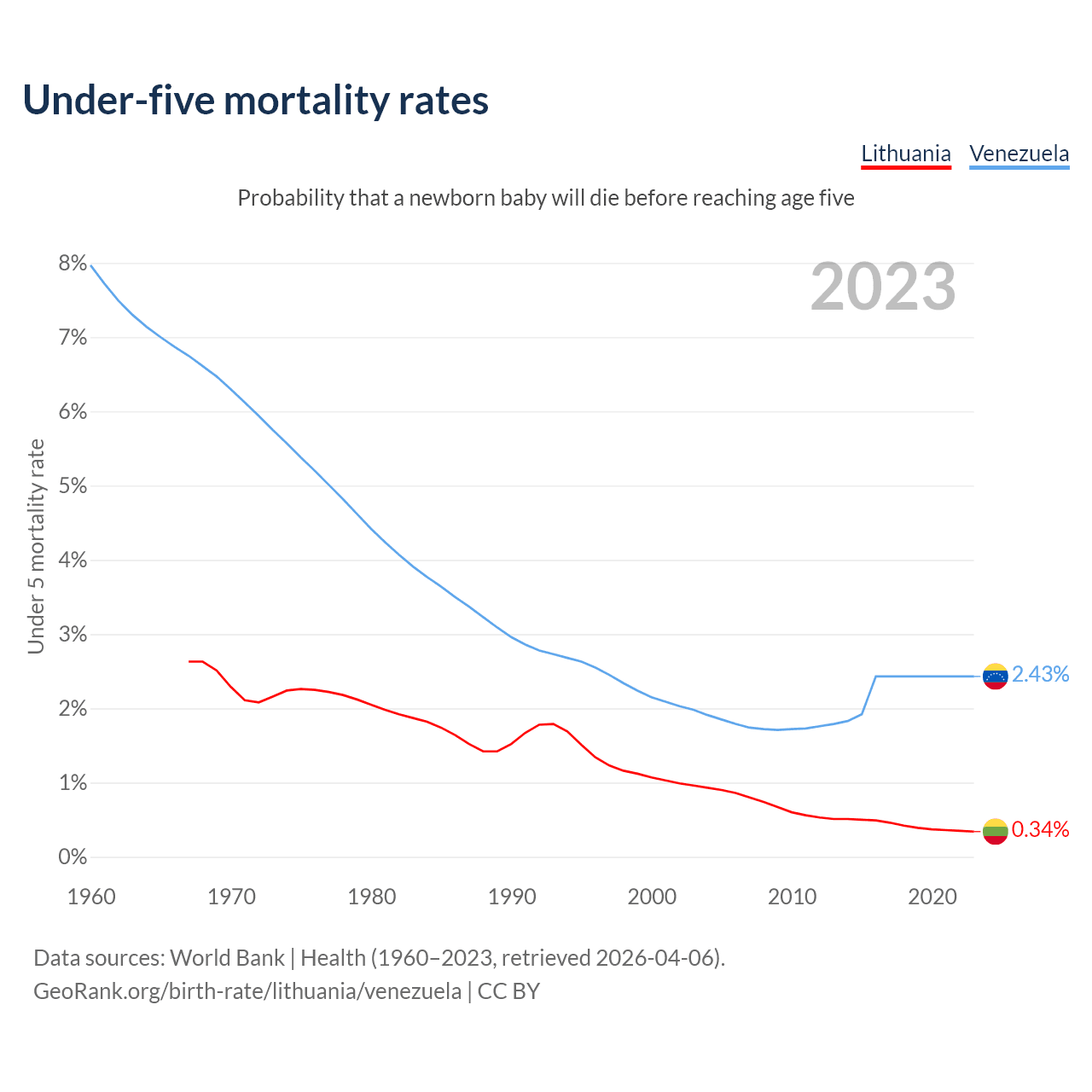 The chance that a newborn baby will die before reaching age five is 0.34% in Lithuania and 2.43% in Venezuela. Above is a chart with historical data on under-five mortality rates.