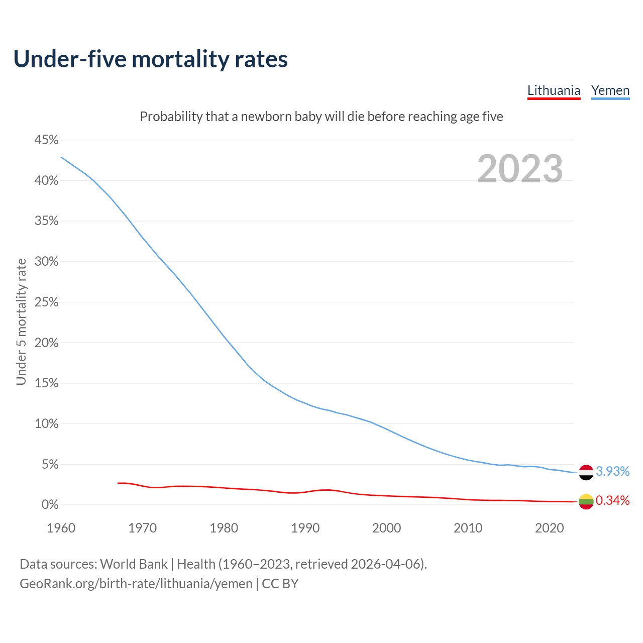The chance that a newborn baby will die before reaching age five is 0.34% in Lithuania and 3.93% in Yemen. Above is a chart with historical data on under-five mortality rates.