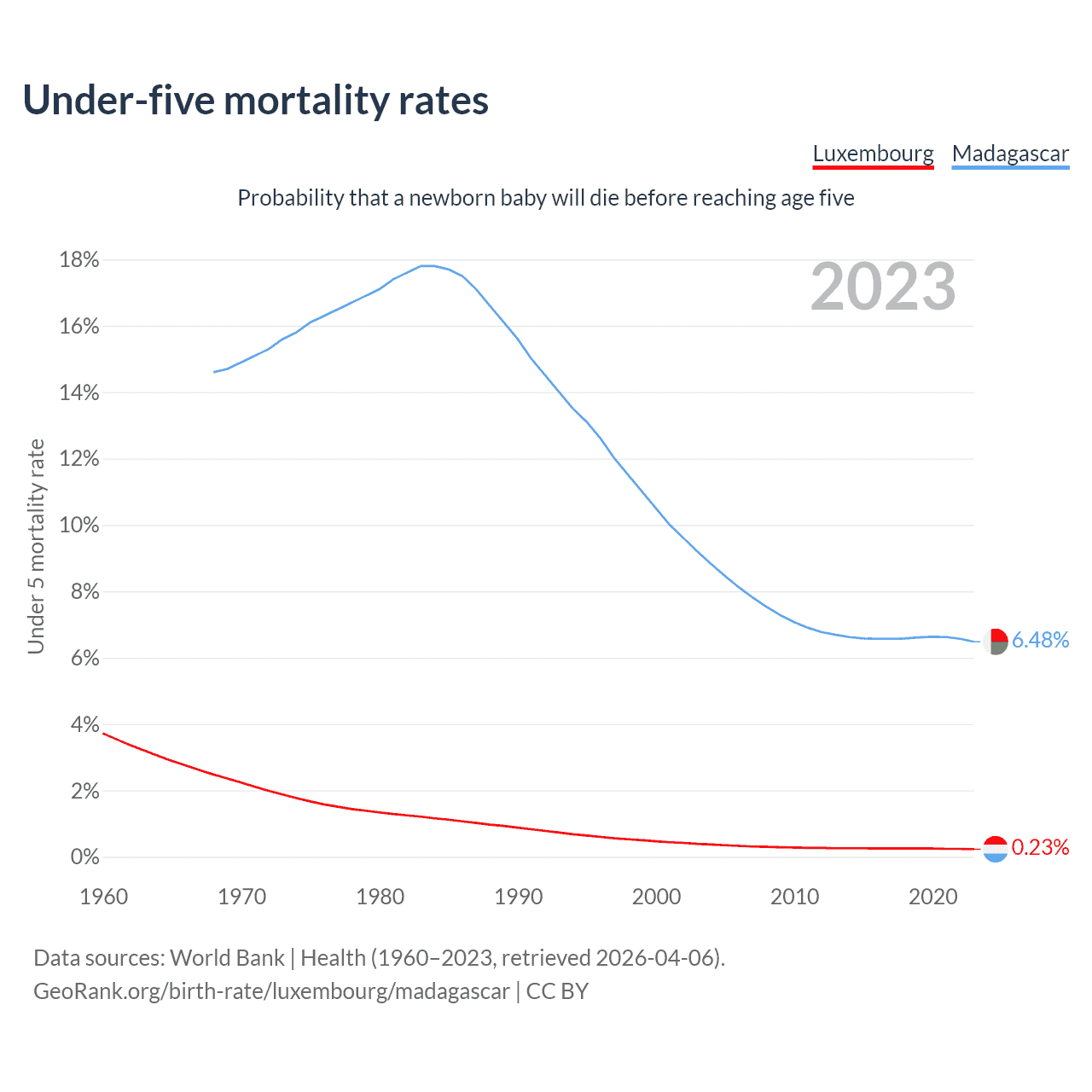 The chance that a newborn baby will die before reaching age five is 0.23% in Luxembourg and 6.48% in Madagascar. Above is a chart with historical data on under-five mortality rates.
