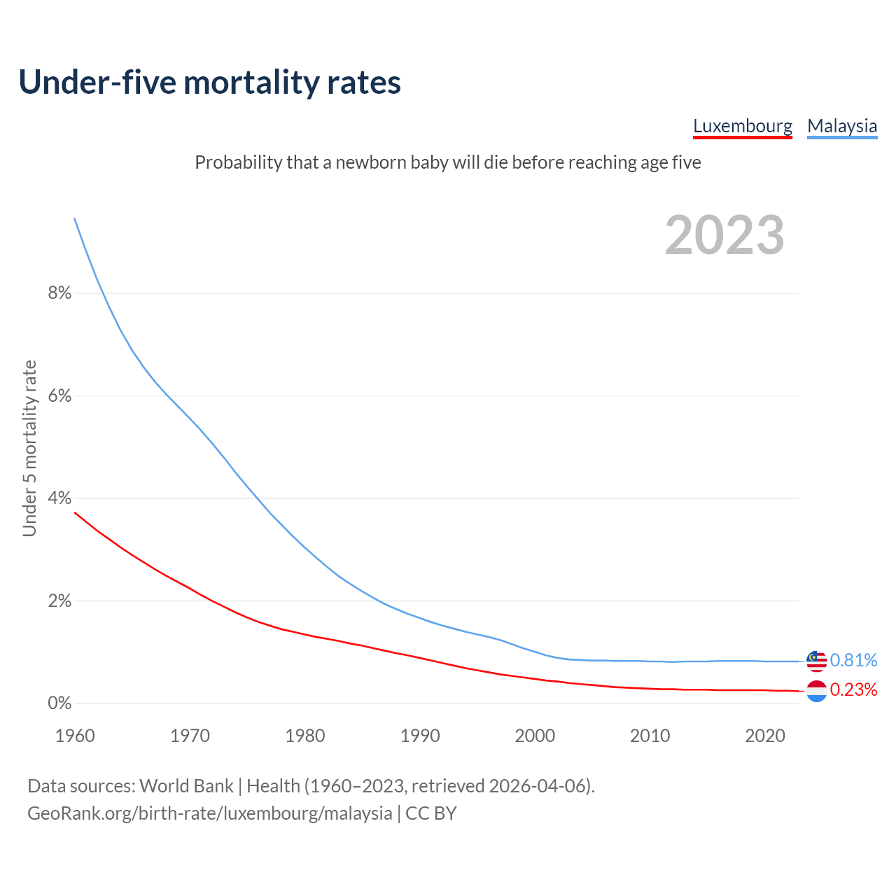 The chance that a newborn baby will die before reaching age five is 0.23% in Luxembourg and 0.81% in Malaysia. Above is a chart with historical data on under-five mortality rates.