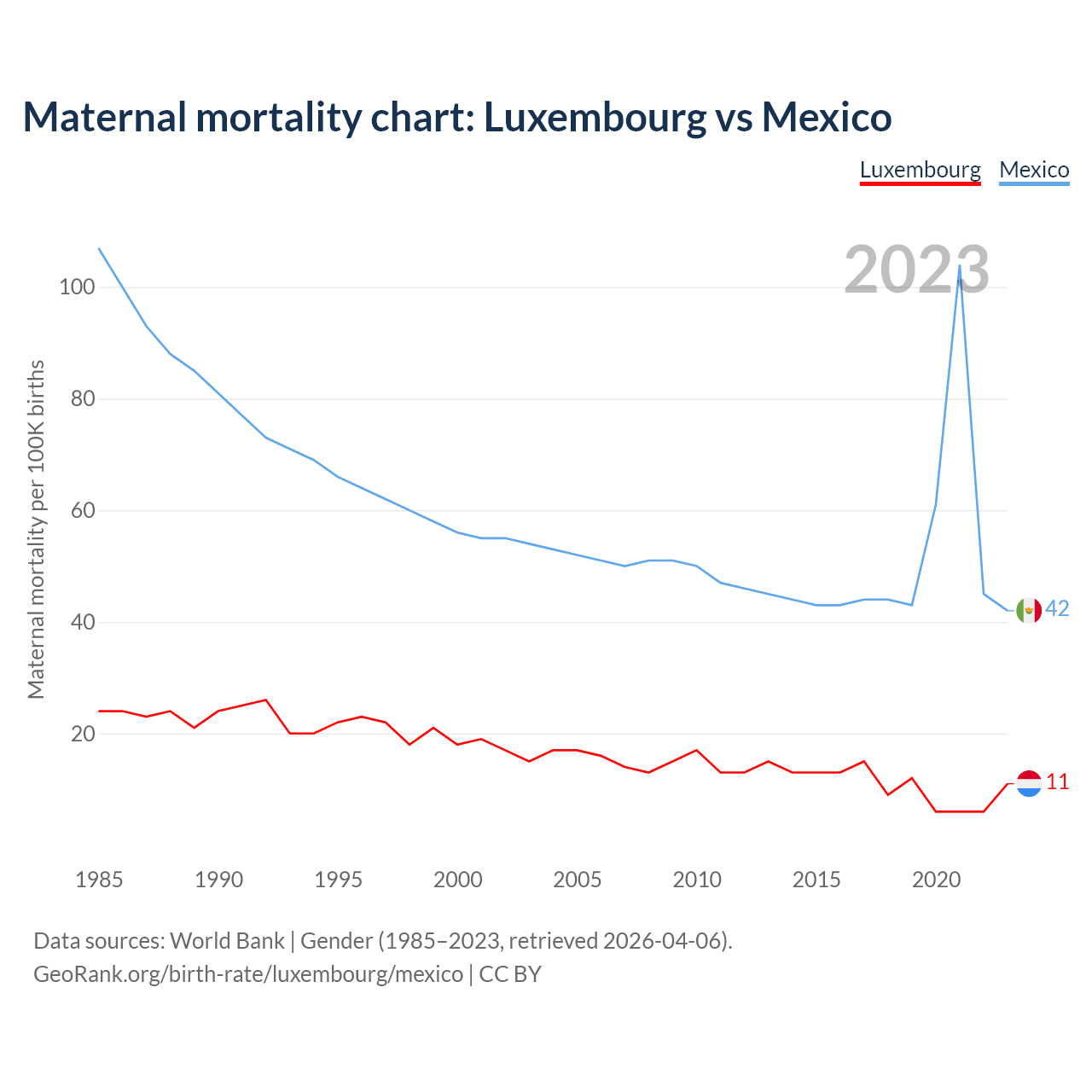 The maternal mortality rate, which is the probability of dying during childbirth or within 42 days of pregnancy termination, is 11 deaths per 100,000 live births in Luxembourg, compared to 42 deaths in Mexico.