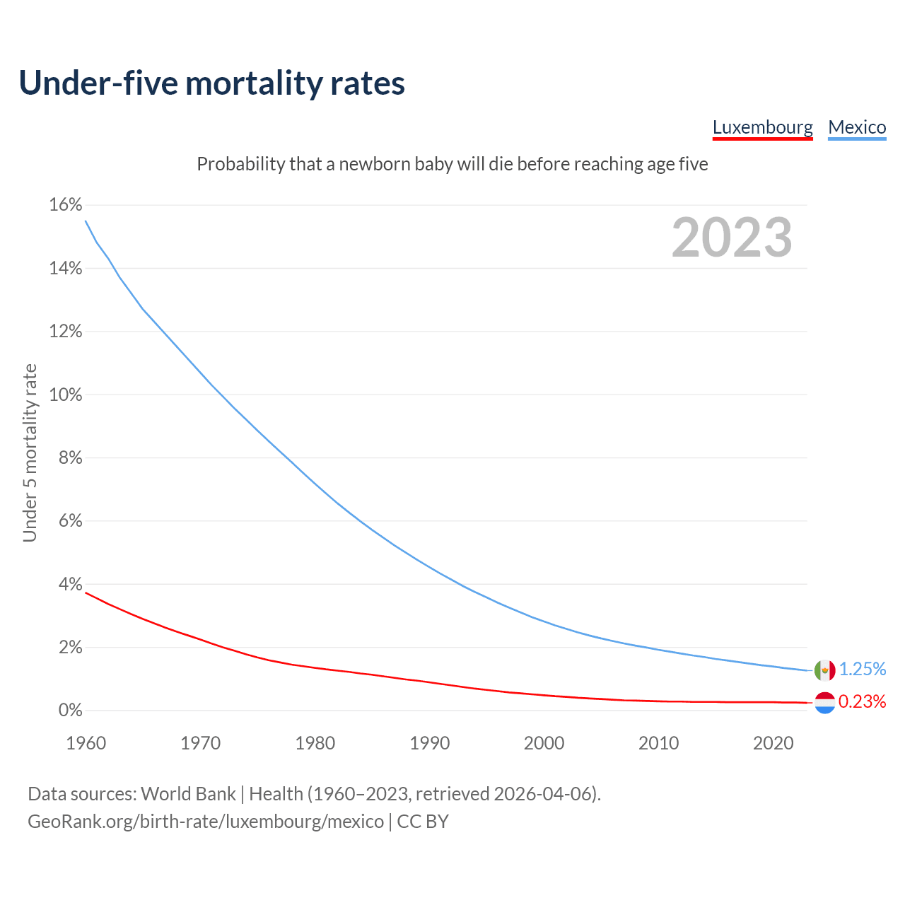 The chance that a newborn baby will die before reaching age five is 0.23% in Luxembourg and 1.25% in Mexico. Above is a chart with historical data on under-five mortality rates.
