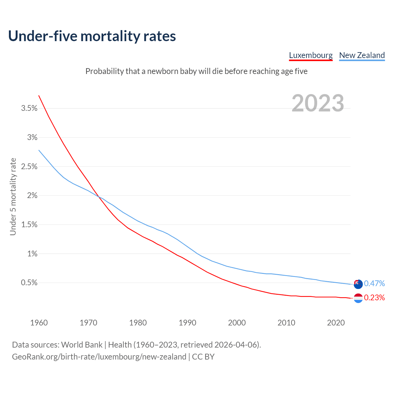The chance that a newborn baby will die before reaching age five is 0.23% in Luxembourg and 0.47% in New Zealand. Above is a chart with historical data on under-five mortality rates.