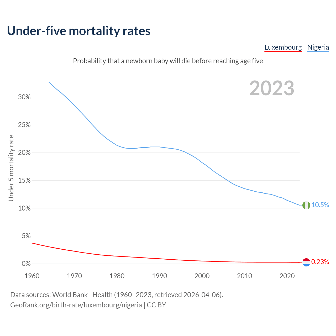 The chance that a newborn baby will die before reaching age five is 0.23% in Luxembourg and 10.5% in Nigeria. Above is a chart with historical data on under-five mortality rates.
