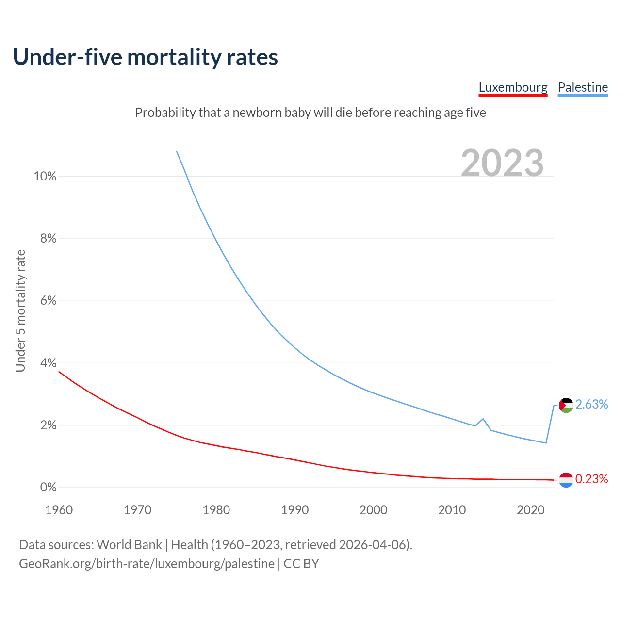 The chance that a newborn baby will die before reaching age five is 0.23% in Luxembourg and 2.63% in Palestine. Above is a chart with historical data on under-five mortality rates.