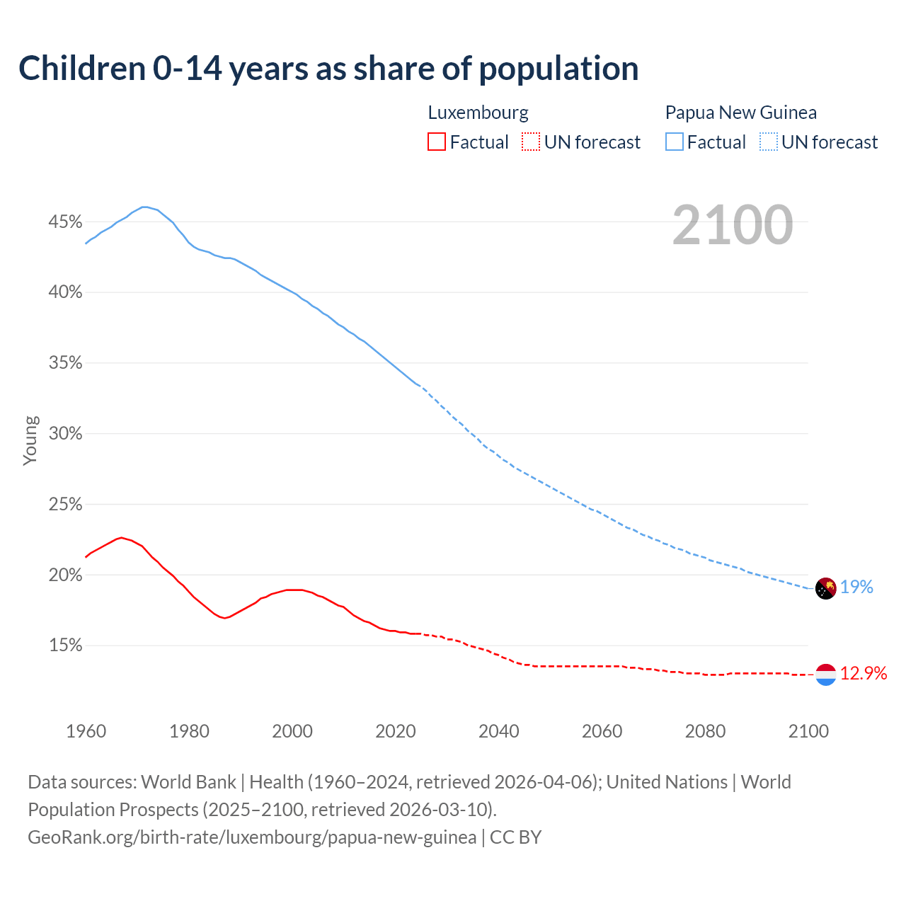 Luxembourg has an annual birth rate of 9.5 births per 1,000 people, compared to 24.6 for Papua New Guinea. The average number of children a woman is expected to have during her lifetime — the fertility rate, is 1.25 in Luxembourg and 3.1 in Papua New Guinea — 147.9% difference.