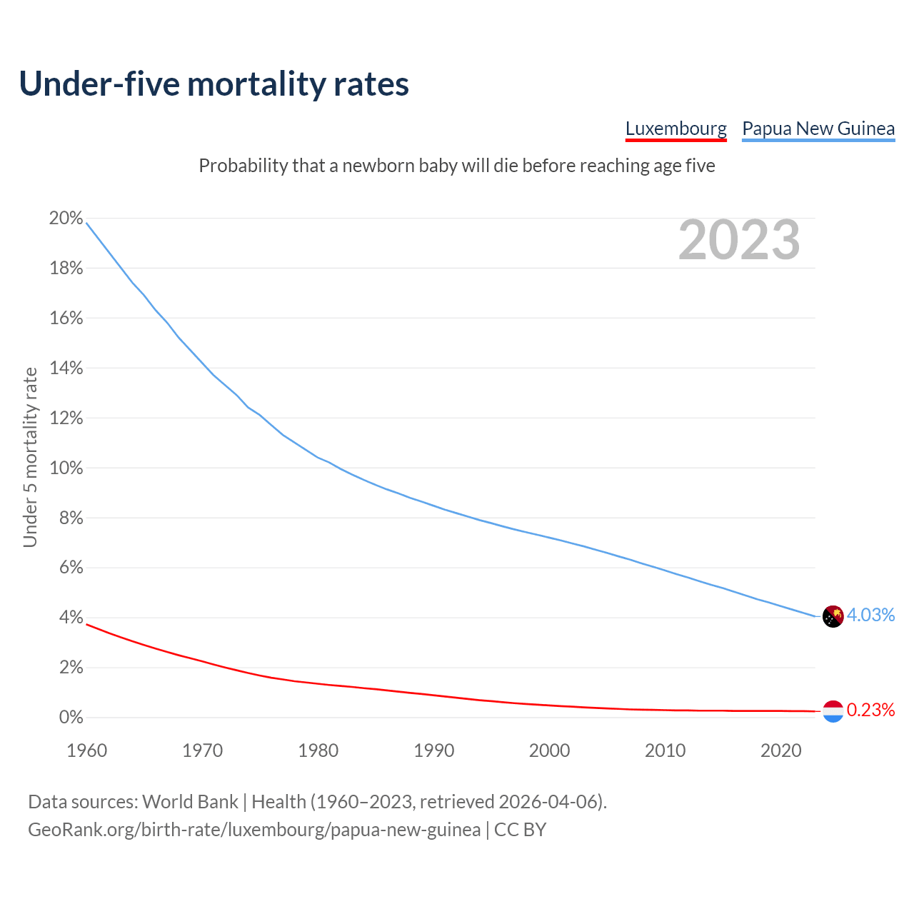 The chance that a newborn baby will die before reaching age five is 0.23% in Luxembourg and 4.03% in Papua New Guinea. Above is a chart with historical data on under-five mortality rates.