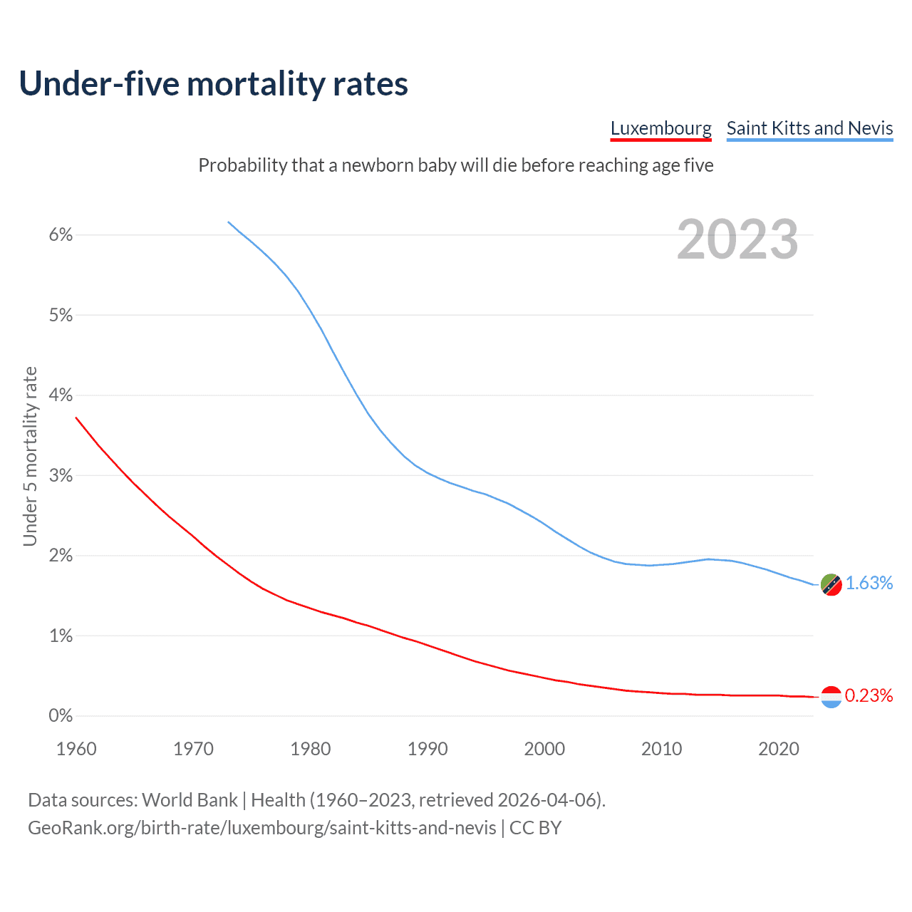 The chance that a newborn baby will die before reaching age five is 0.23% in Luxembourg and 1.63% in Saint Kitts and Nevis. Above is a chart with historical data on under-five mortality rates.
