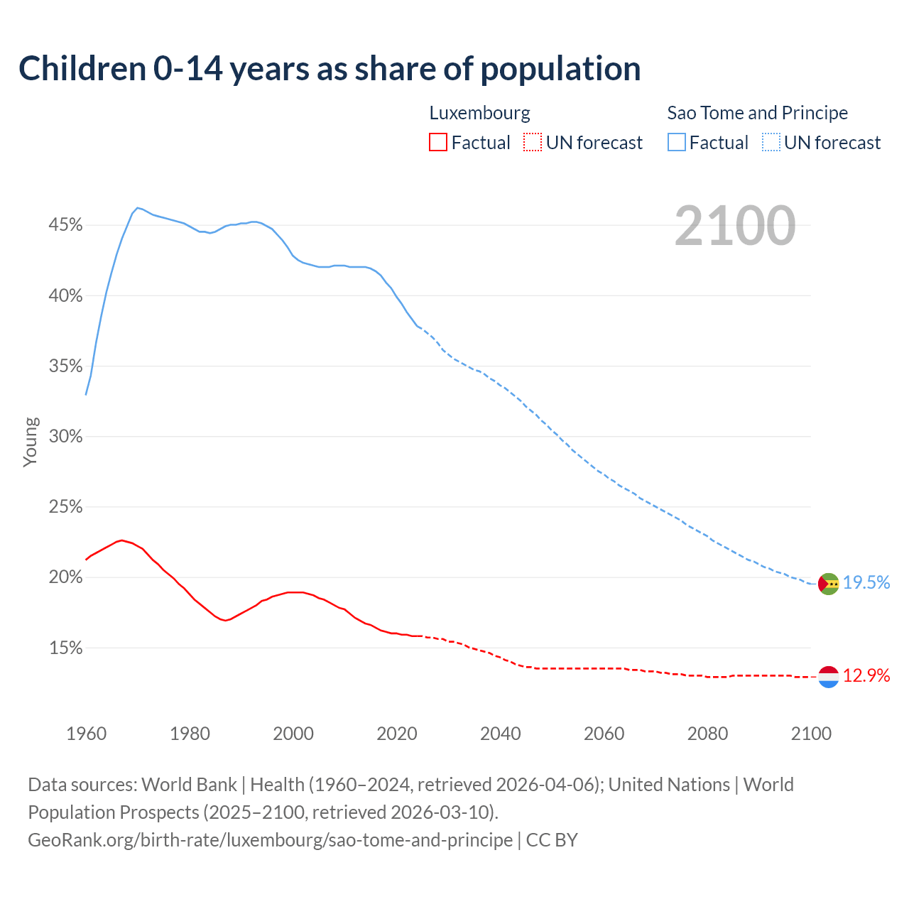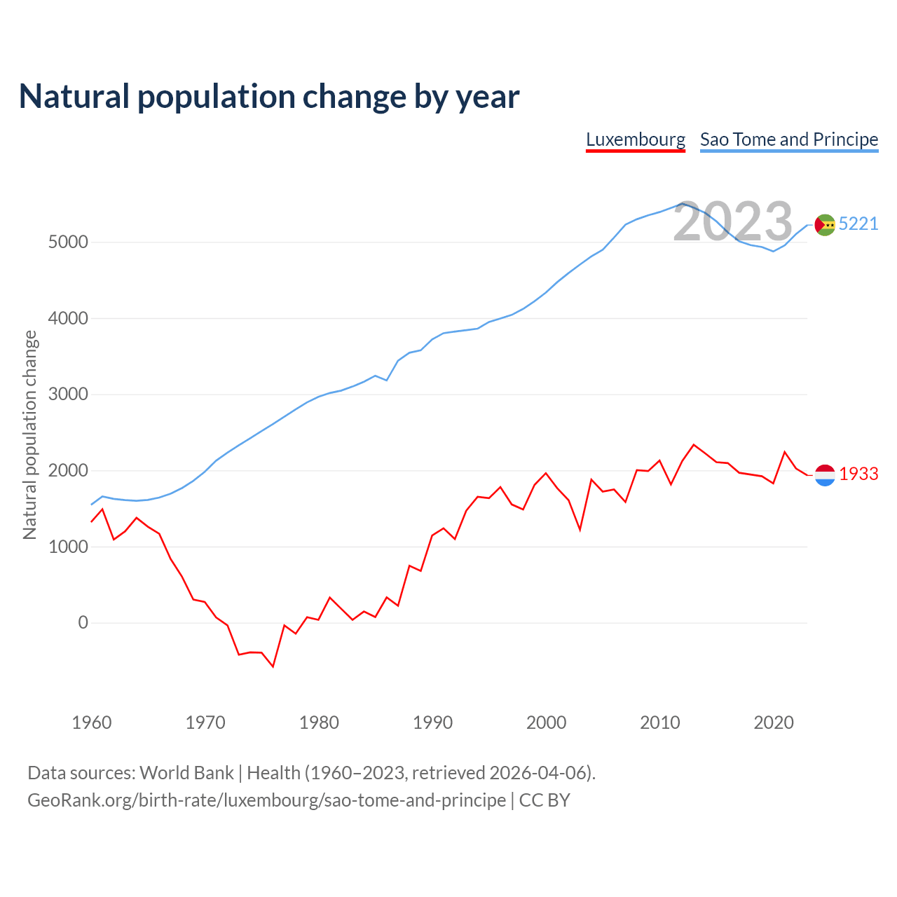 Luxembourg has an annual birth rate of 9.5 births per 1,000 people, compared to 28.2 for Sao Tome and Principe. The average number of children a woman is expected to have during her lifetime — the fertility rate, is 1.25 in Luxembourg and 3.64 in Sao Tome and Principe — 191.5% difference.