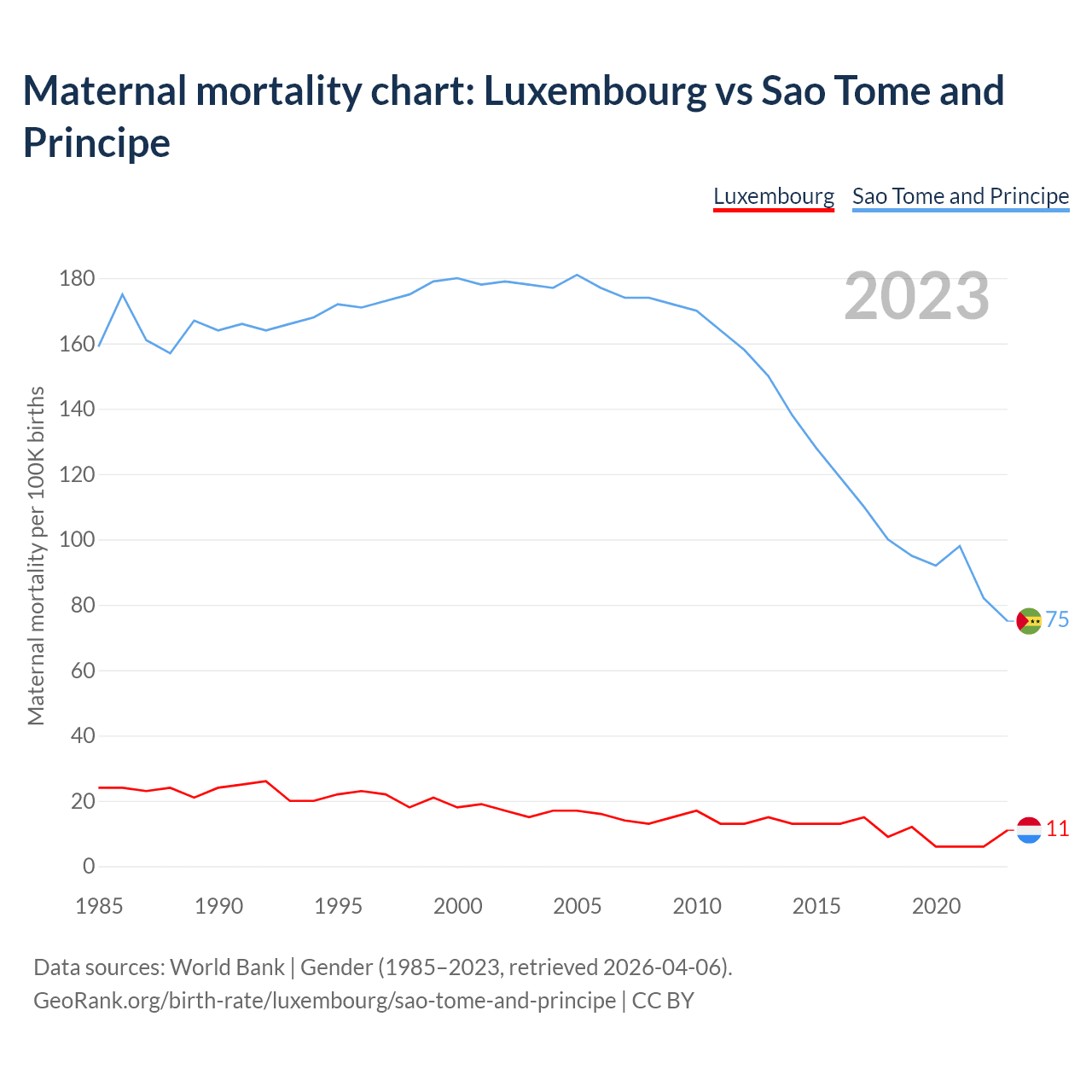 The maternal mortality rate, which is the probability of dying during childbirth or within 42 days of pregnancy termination, is 11 deaths per 100,000 live births in Luxembourg, compared to 75 deaths in Sao Tome and Principe.