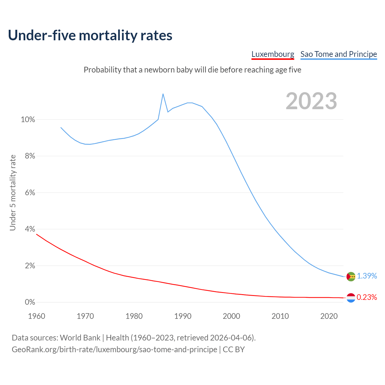 The chance that a newborn baby will die before reaching age five is 0.23% in Luxembourg and 1.39% in Sao Tome and Principe. Above is a chart with historical data on under-five mortality rates.