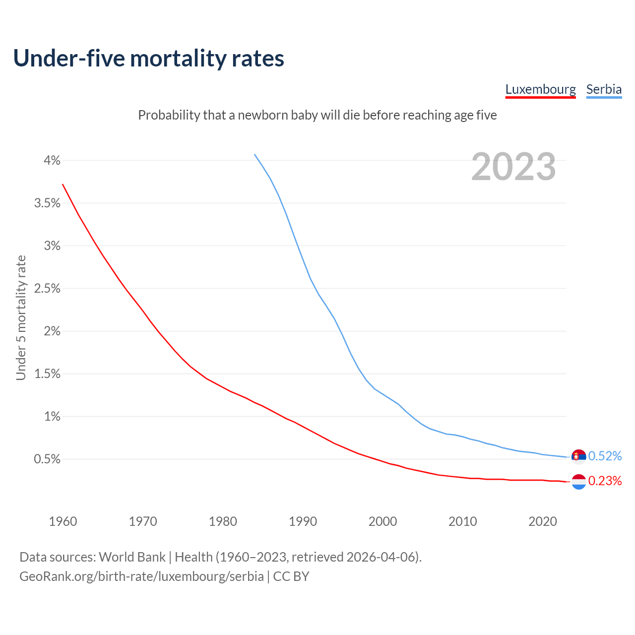 The chance that a newborn baby will die before reaching age five is 0.23% in Luxembourg and 0.52% in Serbia. Above is a chart with historical data on under-five mortality rates.