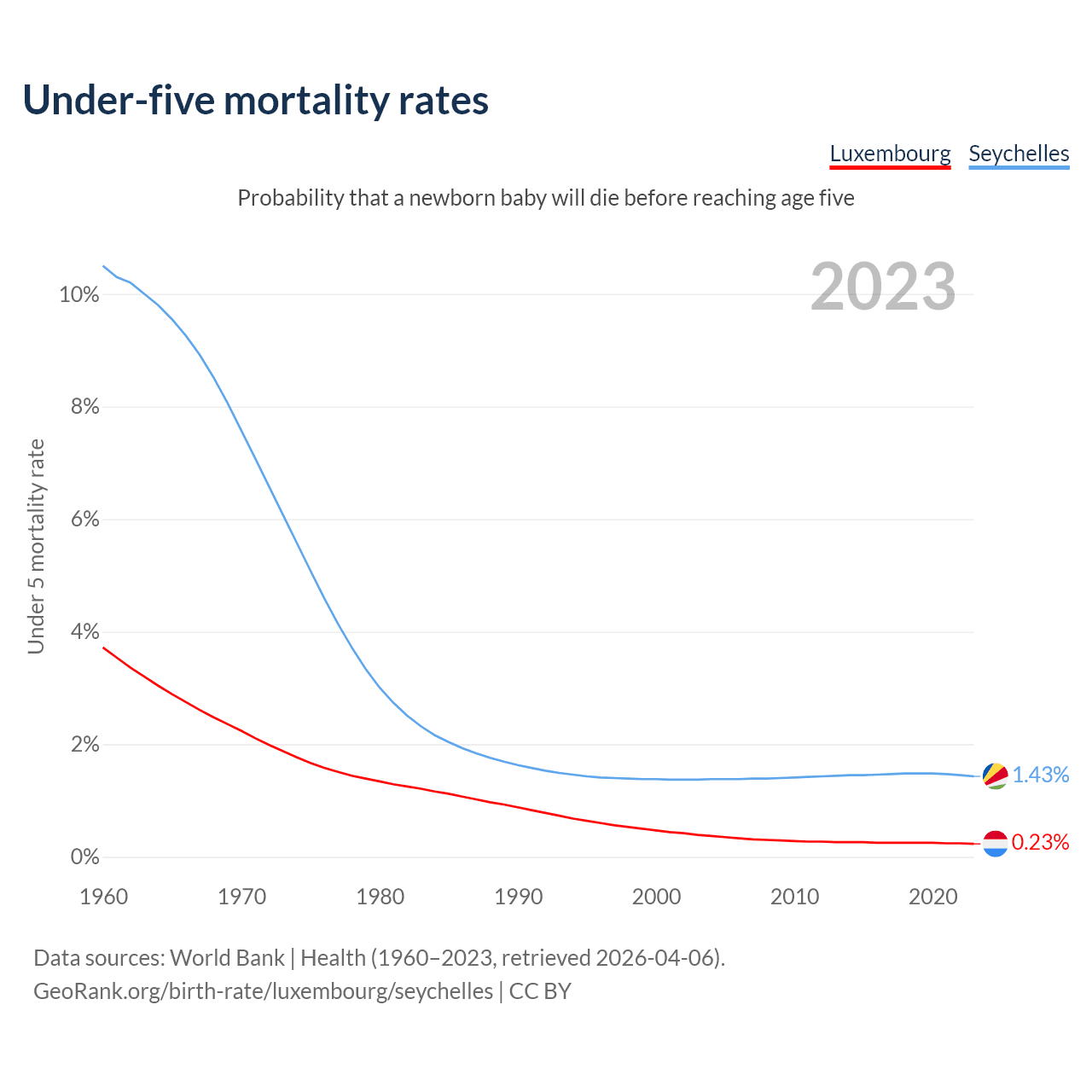 The chance that a newborn baby will die before reaching age five is 0.23% in Luxembourg and 1.43% in the Seychelles. Above is a chart with historical data on under-five mortality rates.