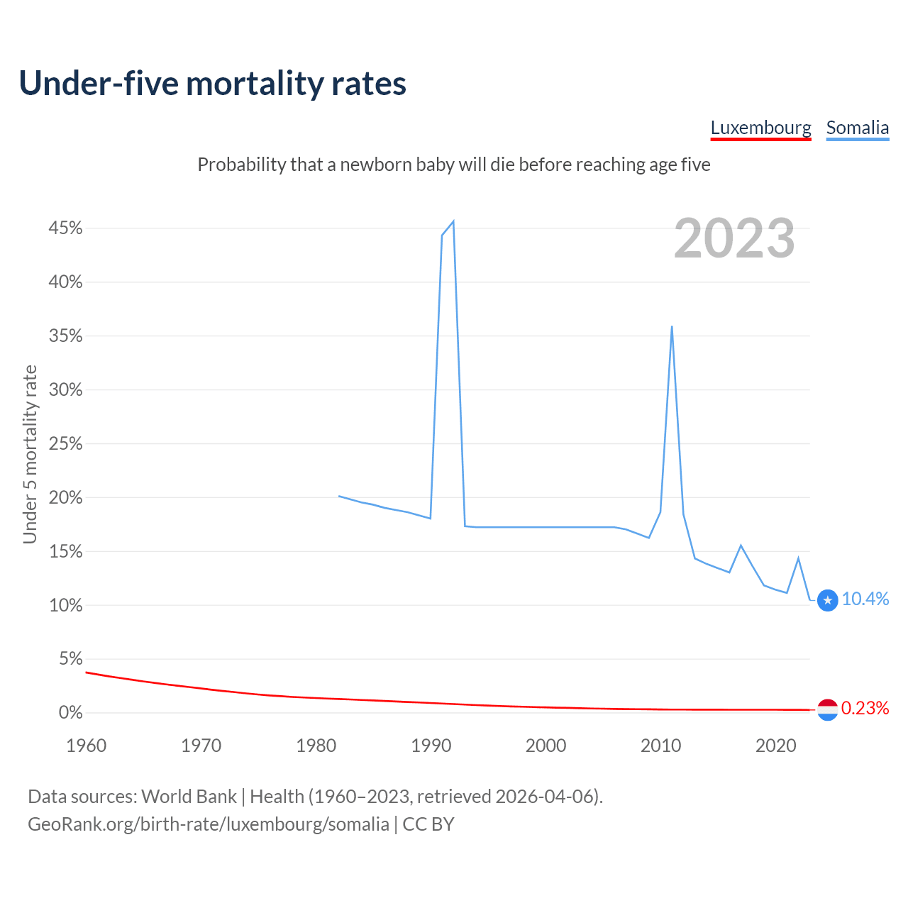 The chance that a newborn baby will die before reaching age five is 0.23% in Luxembourg and 10.4% in Somalia. Above is a chart with historical data on under-five mortality rates.